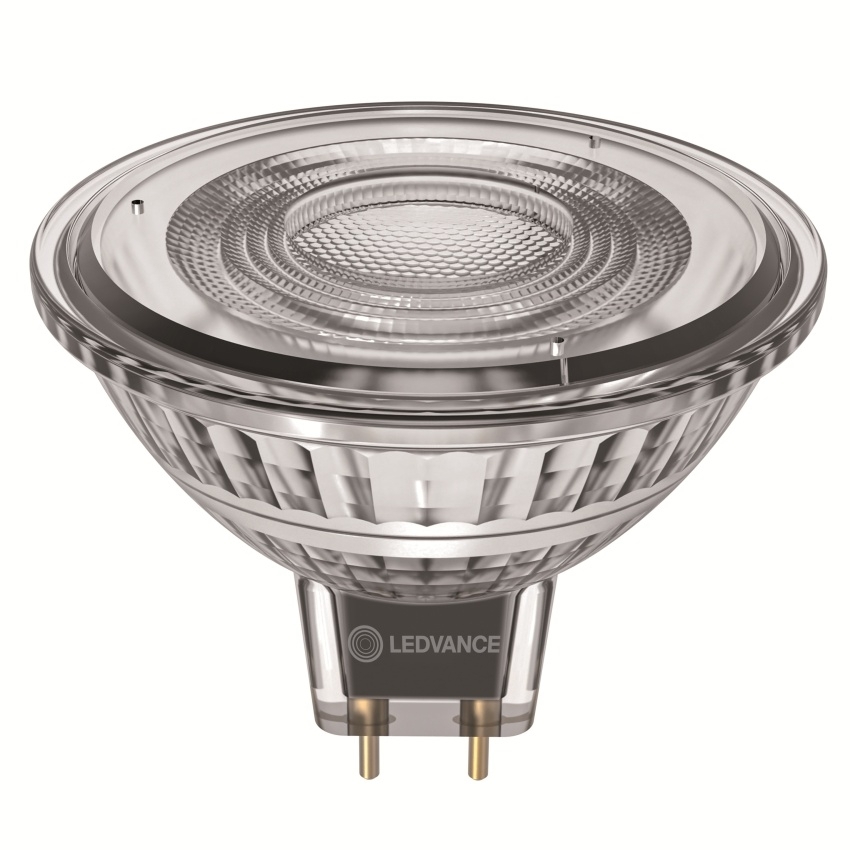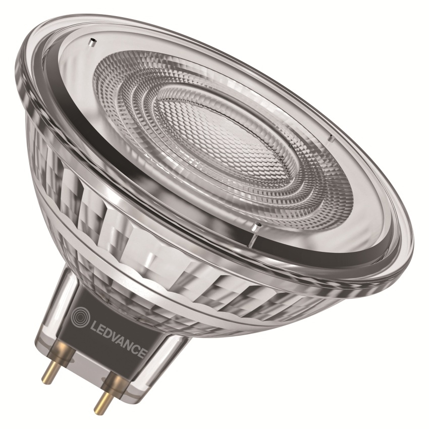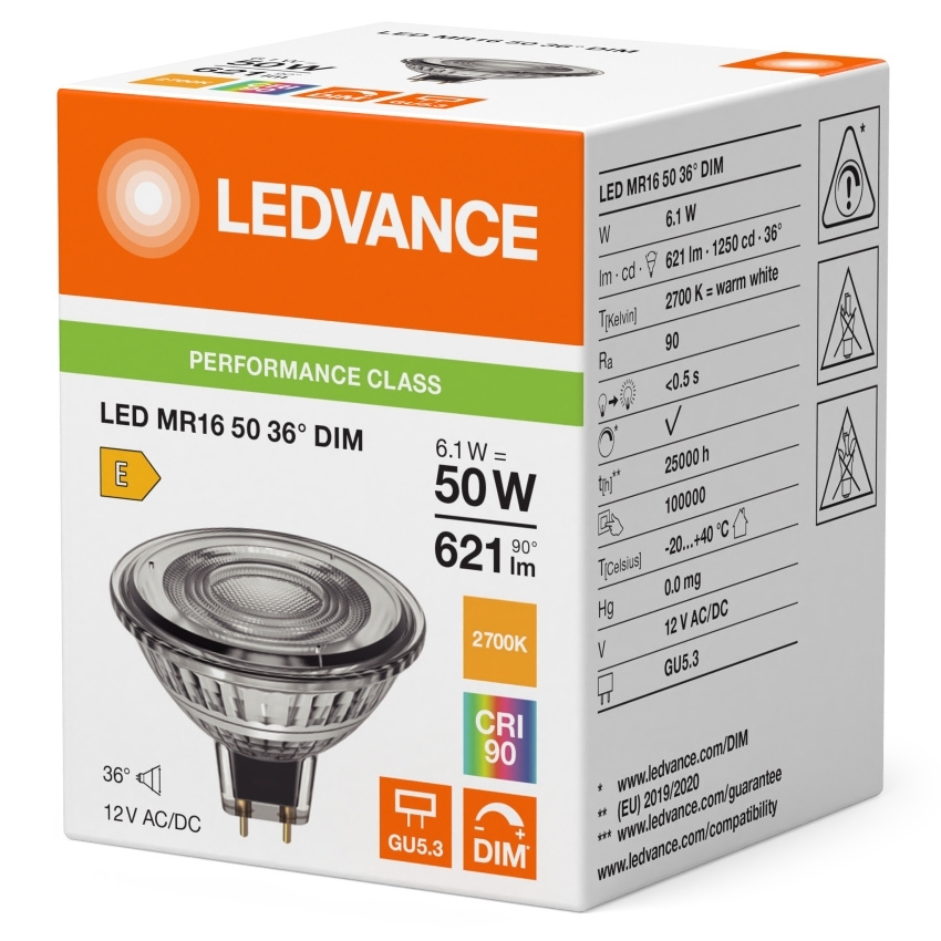 LEDVANCE LED MR16 50 36° DIM P 6,1W 927 GU5.3 je stmívatelný LED světelný zdroj s vyzařovacím úhlem 36°, světelným tokem 621 lm a teplotou chromatičnosti 2700 K.