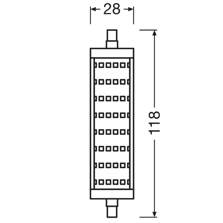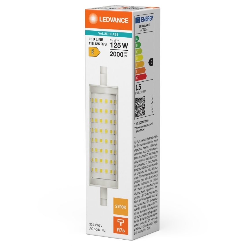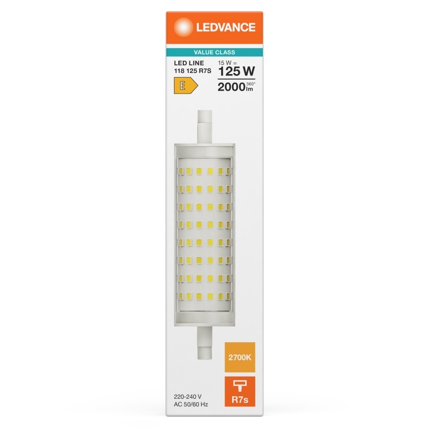 LED Line 118 125 300° P 15W 827 Clear R7s je LED alternativa ke konvenčním světelným zdrojům R7s určená pro napájení ze sítě 220 až 240 V. Jmenovitý výkon je 15 W, světelný tok 2000 lm a světelná účinnost 133 lm/W, přičemž odpovídá klasickému zdroji o výkonu 125 W. Teplota chromatičnosti činí 2700 K, barva světla teplá bílá (827) a index podání barev Ra 80 se standardní odchylkou sladění barev ≤6 sdcm. Vyzařovací úhel je 300°, doba startu < 0,5 s a doba zahřívání (60 %) < 0,5 s. Světelný zdroj má patici R7s, průhledné provedení, krytí IP20 a je určen pouze pro vnitřní použití. Mezi výhody patří kompatibilita s většinou svítidel R7s díky excentrické patici, dobrý rozptyl světla po celém prostoru, nižší vyzařování tepla ve srovnání se standardním referenčním výrobkem, dlouhá životnost až 15000 h a nižší spotřeba energie než u žárovek nebo halogenových žárovek.