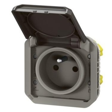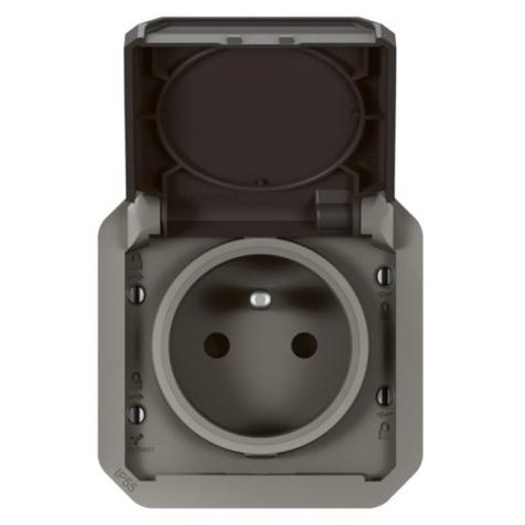 LEGRAND Plexo New 069891L je přístrojová zásuvka 2P+T v antracitové barvě s dětskými clonkami, krytím IP55 a odolností IK08, vhodná pro náročné prostředí.