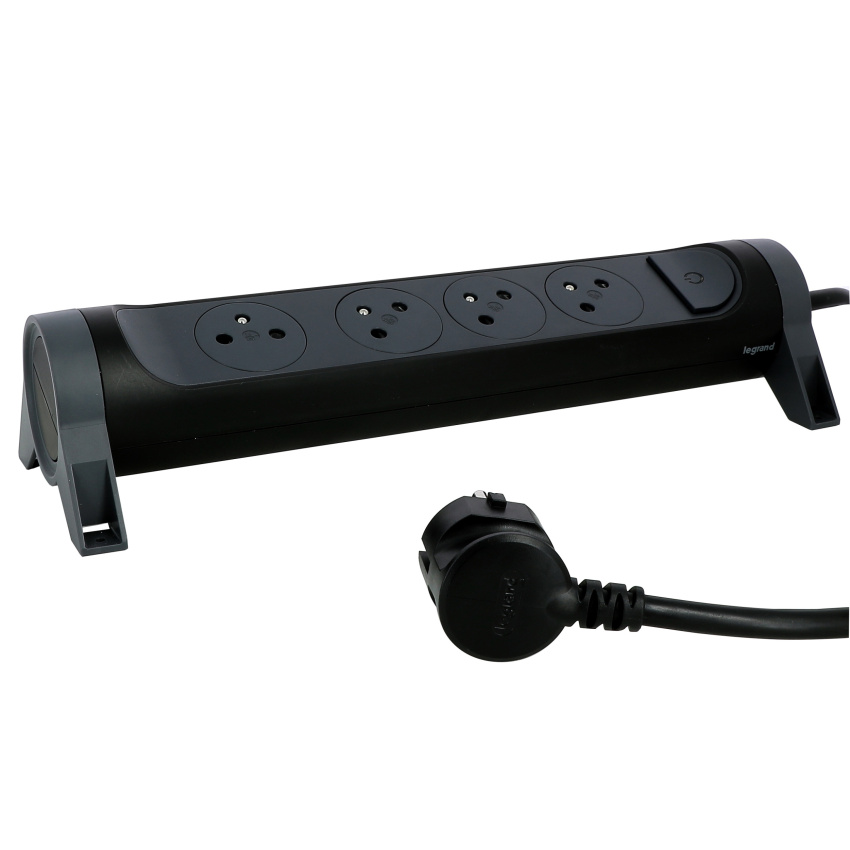 Prodlužovací přívod s válcovým otočným tělem a čtyřmi 2P+T zásuvkami. Díky patentu společnosti Legrand se zarovnaná dna zásuvek zasunou dovnitř až po zastrčení vidlice, tím se dosahuje atraktivního designu a zamezuje hromadění prachu. Pootočené zásuvky poskytují prostor pro připojení i objemnějších nabíječek. Prodlužovací přívod je možné upevnit v horizontální i vertikální poloze a nechybí ani spínač pro vypnutí a zapnutí.