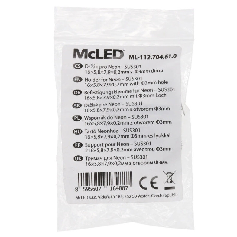 Držák pro Neon 0408 McLED ML-112.703.61.0 je dodáván včetně příslušných šroubů pro uchycení. Doporučeno je použít dle místa instalace 3 až 6 úchytů na metr Neonu. Typ příslušenství je držák, barva nerez a délka 24,5 mm.