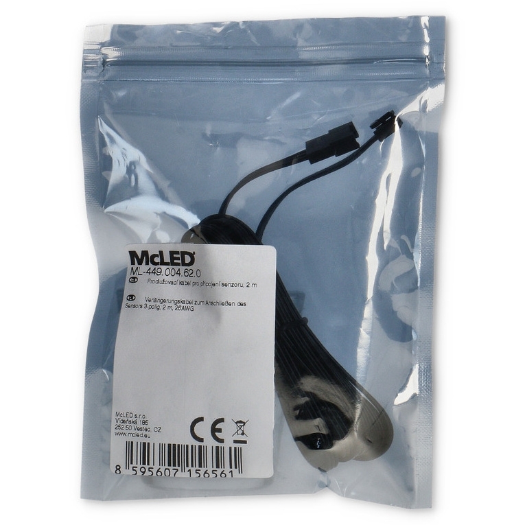 Prodlužovací kabel pro připojení senzoru McLED ML-449.004.62.0 slouží k prodloužení čidel a senzorů zapojovaných na „senzor“ vstup smart zdroje. Typ příslušenství je dálkové ovládání, řízení. Velikost vodiče je AWG 26/0,13, provedení kabelu vidlice (samec) - zásuvka (samice) a barva černá.
