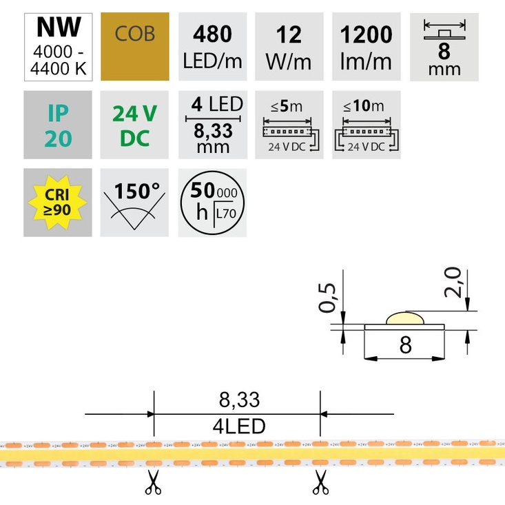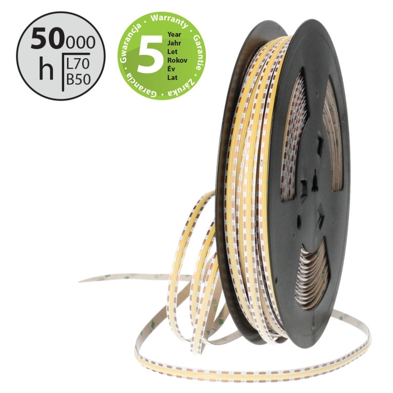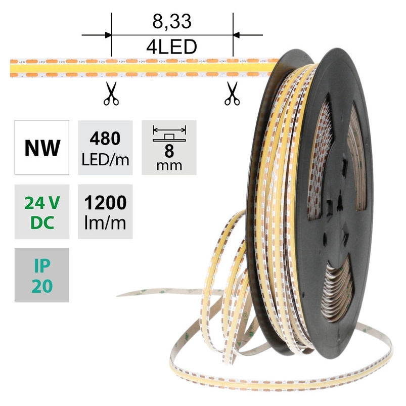 LED pásek COB NW, 480LED/m, 12W/m, DC 24V, 1200lm/m, CRI90, IP20, modul 8,33mm, 8mm, 50m