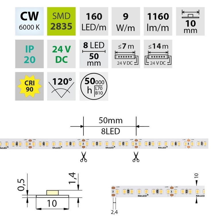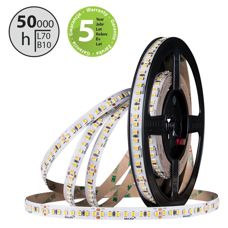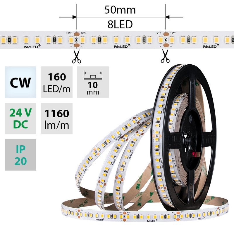 LED pásek McLED SMD2835 CW, 160LED/m, 9W/m, 24V, 1160lm/m, CRI90, IP20, studená bílá