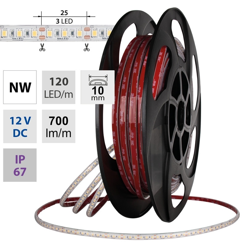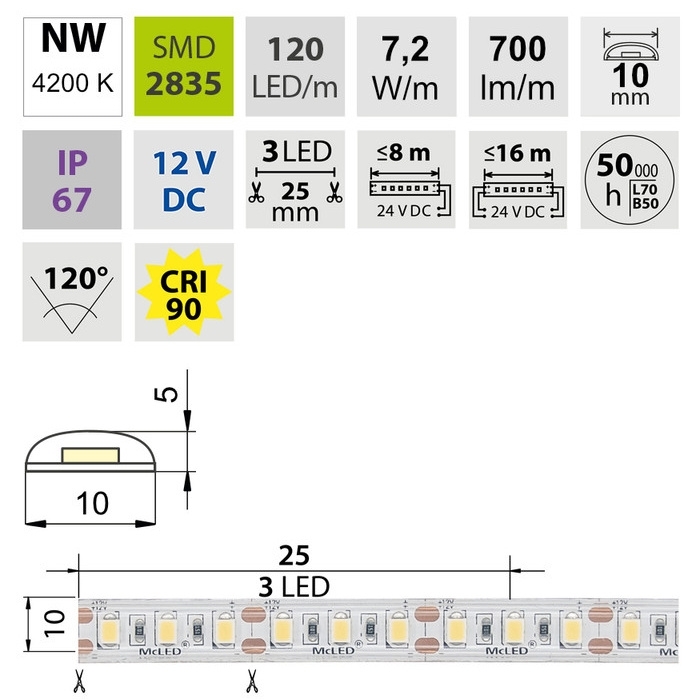 LED pásek SMD2835 NW McLED ML-121.007.90.0 má neutrální bílou barvu světla 4200 K. Příkon je 7,2 W/m, hustota 120 LED/m, světelný tok 700 lm/m, index podání barev CRI>90 a krytí IP67. Napájení je DC 12 V, segment 25 mm, 3 LED/segment, šíře pásku 10 mm a délka balení 5 m. Pásek má bílý PCB podklad, je opatřen samolepicí páskou 3M, je UV stabilní, max. délka pásku při jednostranném zapojení je 5 m a životnost je 50000 h.