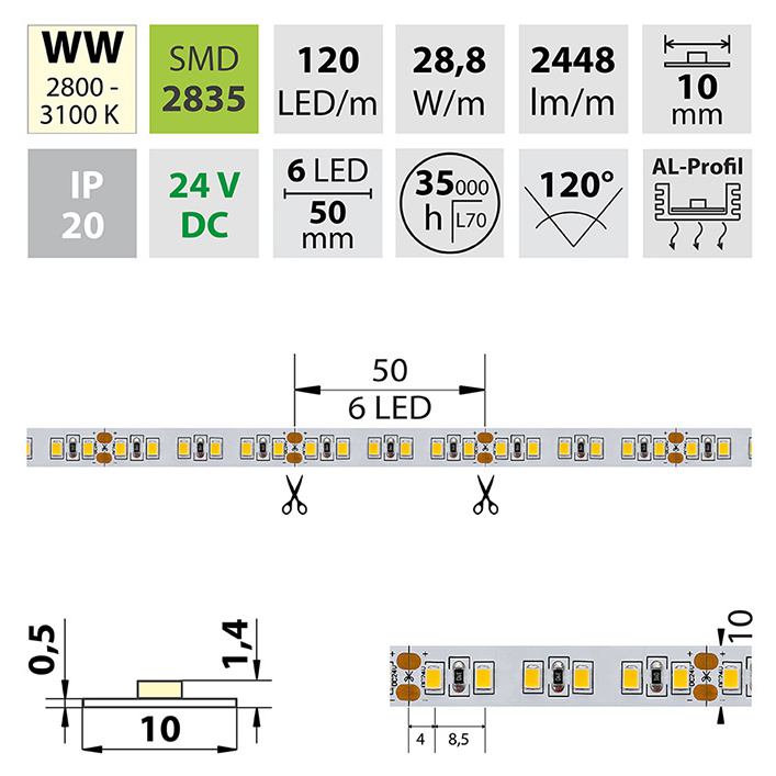 LED pásek SMD2835, 2800-3100K (teple bílý WW), 28,8W, 120LED, 2448lm/m, CRI>90, segment 50mm, 6LED/segment, IP20, DC 24V, životnost 54000h, šíře 10mm, bílý PCB pásek, max. délka pásku při jednostranném zapojení: 4m, opatřen samolepící páskou 3M, UV stabilní.