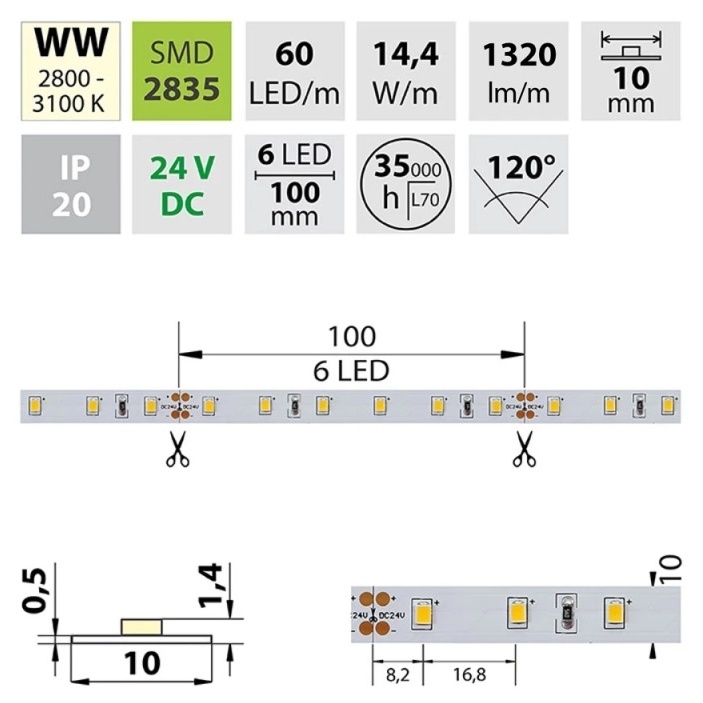 LED pásek MCLED SMD2835 s teplou bílou barvou světla (2800–3100 K) je ideální pro dekorativní i funkční osvětlení v suchých prostorech. Nabízí vysoký světelný tok 1320 lm/m a příkon 14,4 W/m. Díky segmentům po 100 mm lze pásek snadno přizpůsobit požadované délce. Opatřen kvalitní samolepicí páskou 3M pro snadnou instalaci. Balení obsahuje 5 m pásku.