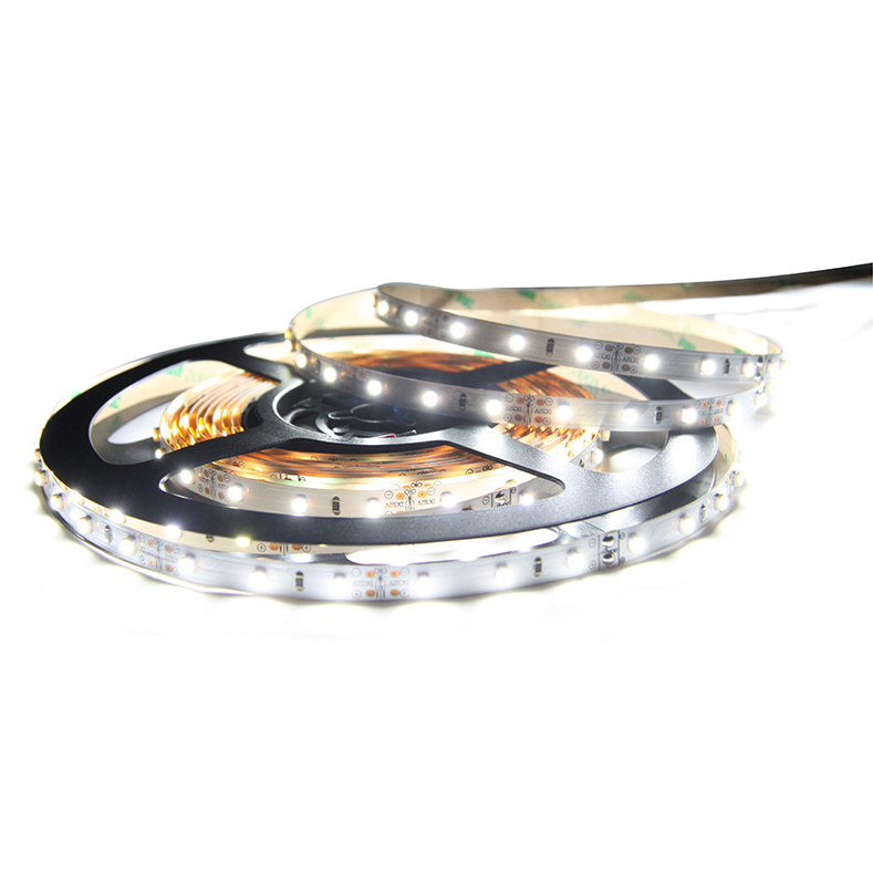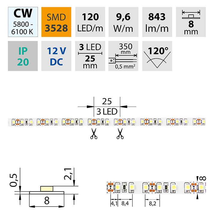 LED pásek SMD3528, studená bílá (6000K), 9,6W, 120LED, 843lm/m, segment 25mm, 3LED/segment, IP20, DC 12V, životnost 54000h, šíře 8mm, bílý PCB pásek, max. délka pásku při jednostranném zapojení: 5m, opatřen samolepící páskou 3M, UV stabilní.