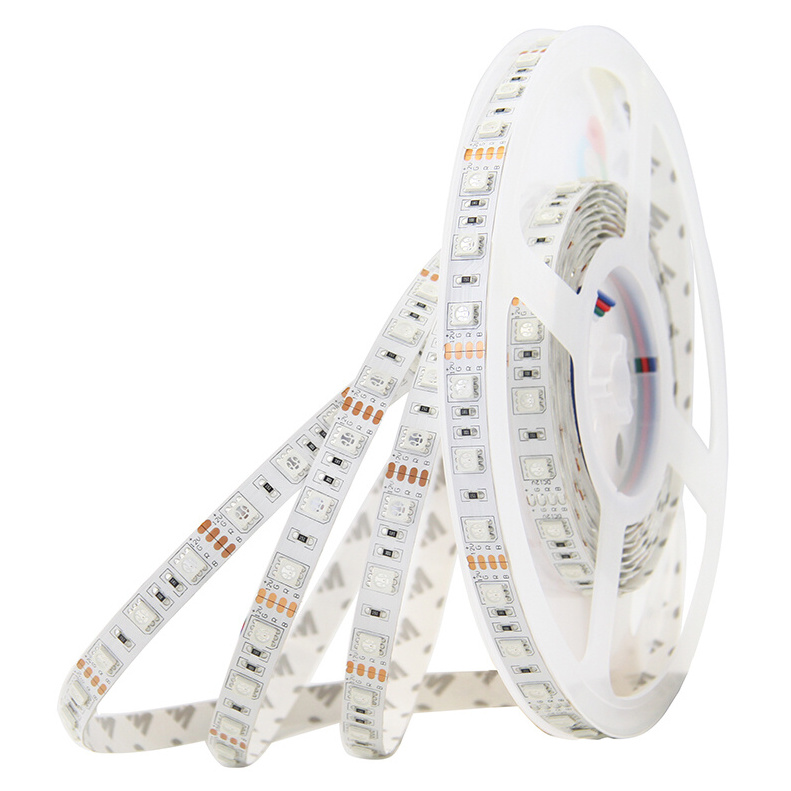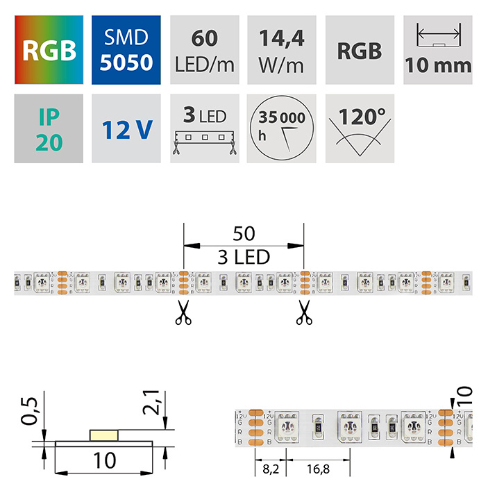 LED pásek SMD5050, RGB - barevný, 14,4W, 60LED, segment 50mm, 3LED/segment, IP20, DC 12V, životnost 54000h, šíře 10mm, bílý PCB pásek, max. délka pásku při jednostranném zapojení: 5m, opatřen samolepící páskou 3M.