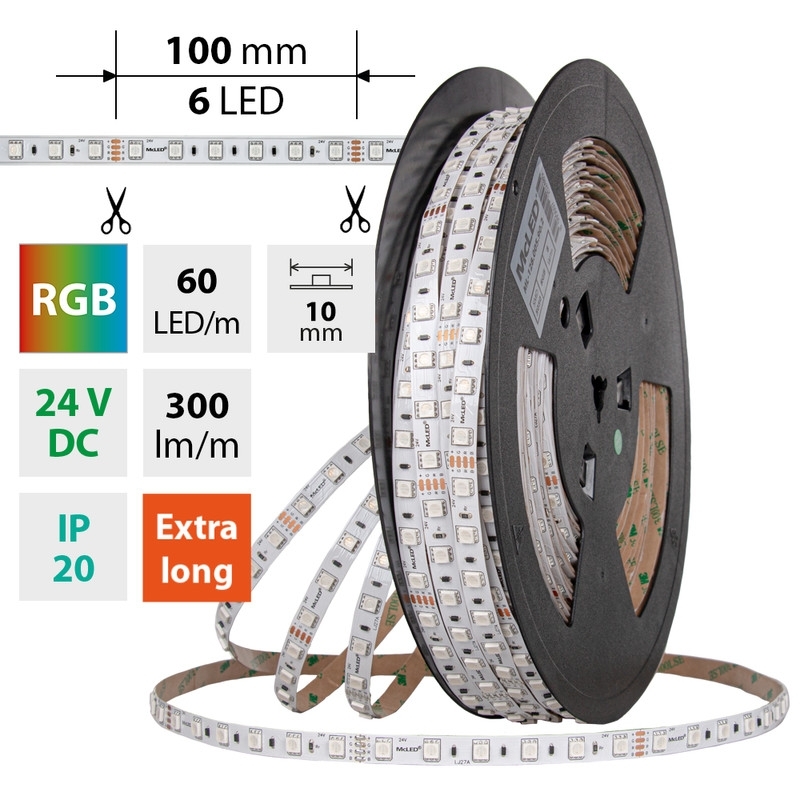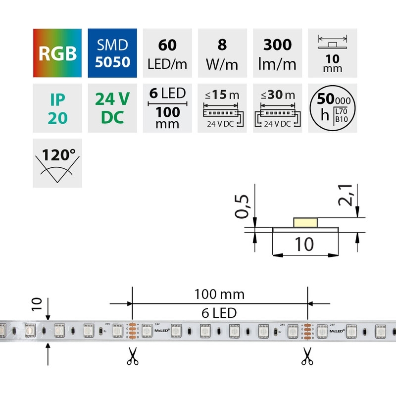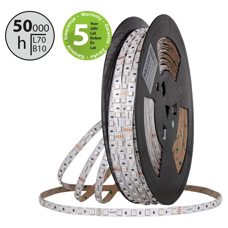 LED pásek SMD5050 RGB McLED ML-128.005.90.0 je stmívatelný LED pásek s barevným světlem RGB. Počet LED na metr je 60, výkon na metr 8 W, světelný tok na metr 300 lm a napětí světelného zdroje 24 V DC. Pásek má krytí IP20, šířku 10 mm, výšku 2,1 mm, délku segmentů 100 mm, 6 LED na segment a délku 5 m. Typ čipu je SMD 5050, barva základny bílá, způsob montáže povrchová montáž, způsob připojení kabel a počet pólů 4. Max. délka pásku při jednostranném napájení je 15 m a při oboustranném napájení 30 m. Pásek je samolepicí a je určen pro suché prostředí.