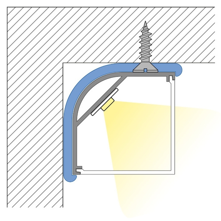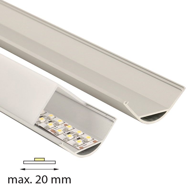 Rohový hliníkový profil McLED® RH s matným difuzorem je určen pro LED pásky do šířky 20 mm a výkonu 28,8 W/m. Poskytuje účinné chlazení, čímž prodlužuje životnost LED pásků, a zároveň chrání před prachem a mechanickým poškozením. Matný difuzor rozptyluje světlo a snižuje oslnění, přičemž propouští více světla než mléčný difuzor. Profil je ideální pro instalaci do rohů místností, kuchyní, nábytku či pro dekorativní osvětlení. Montáž je možná pomocí úchytů, vrutů nebo lepidla.