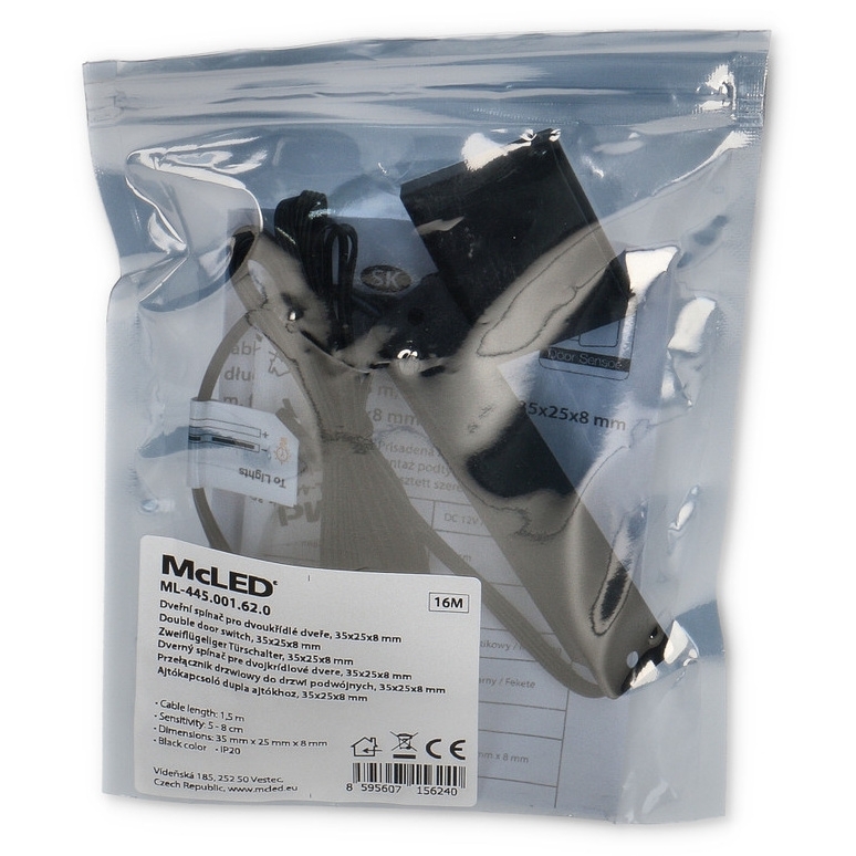 Dveřní spínač (dvojitý) McLED ML-445.001.62.0 je IR dveřní bezdotykový spínač pro 12/24 V DC. Max. výstupní proud je 3 A, stupeň krytí IP20, třída ochrany III a citlivost 5-8 cm. Provedení je povrchová montáž, přisazená montáž ano, zabudovaná montáž ano a montáž na DIN lištu ne. Barva je černá, kryt je plast, rozměry 35 x 25 x 8 mm, kabel 1,5 m a mini konektory 91505-MP/FP. Zpoždění je ZAP/VYP.