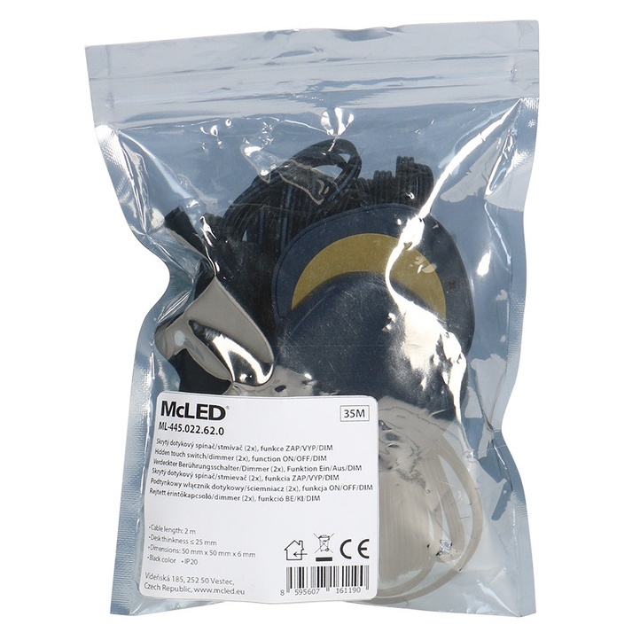 Skrytý dotykový spínač/stmívač McLED ML-445.022.62.0 má 2 senzory a samolepku „Touch Sensor“. Výstupní napětí je 12 - 24 V DC, max. výstupní proud 3 A, stupeň krytí IP20 a třída ochrany III. Provedení je povrchová montáž, zabudovaná montáž ano, přisazená montáž ne a montáž na DIN lištu ne. Barva je černá, kryt je plast, délka kabelu 2 m, mini konektory 91505-MP/FP a rozměry 50 x 50 x 6 mm. Funkce jsou ZAP/VYP/Stmívač.