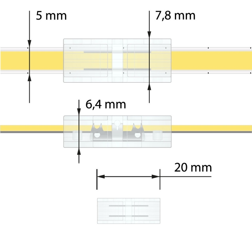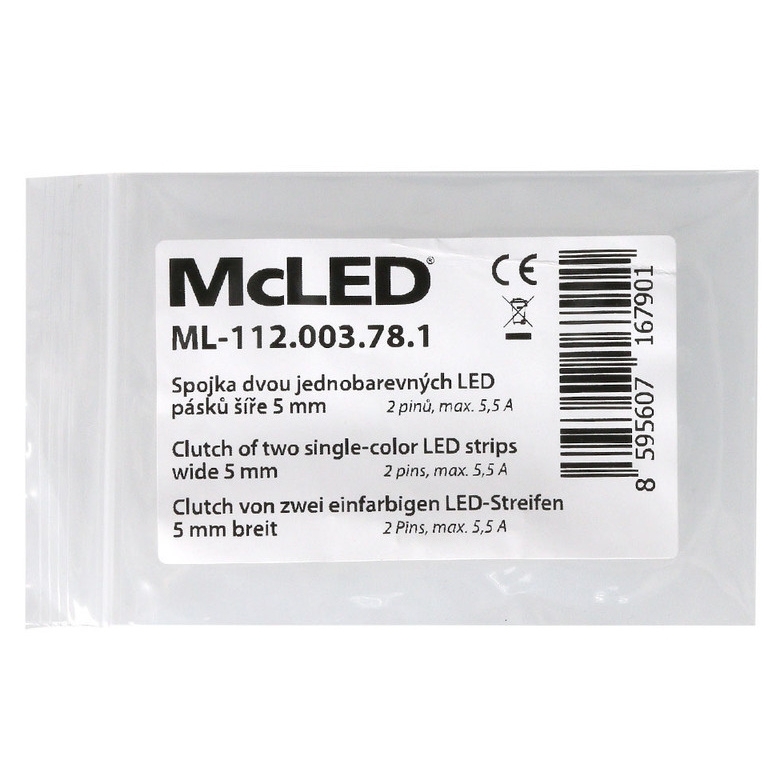 Spojka dvou jednobarevných COB LED pásků McLED ML-112.003.78.1 je určena pro pásky šíře 5 mm. Má 2 piny a maximální proud 5,5 A. Rozměry jsou cca 7,8 x 20,0 x 6,4 mm. Provedení je z transparentního plastu. Slouží k přímému propojení dvou COB LED pásků bez nutnosti pájení. Po nacvaknutí lze použít opakovaně.