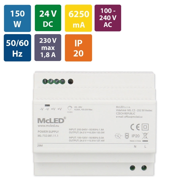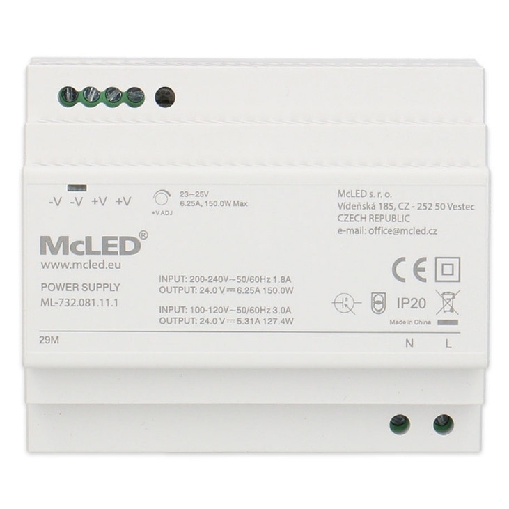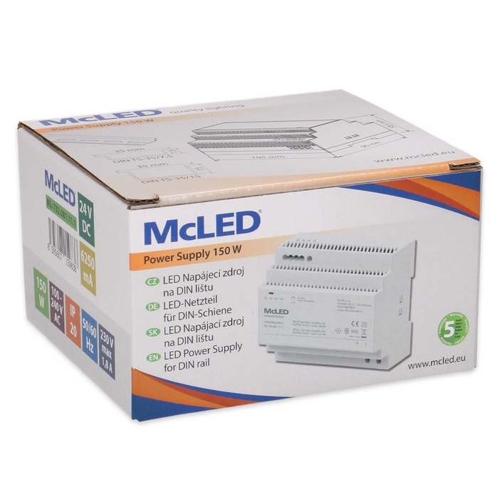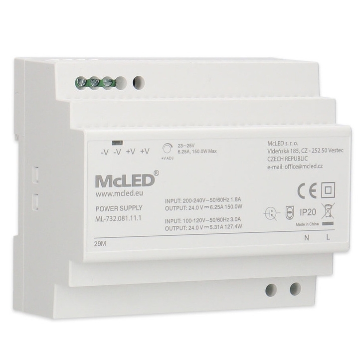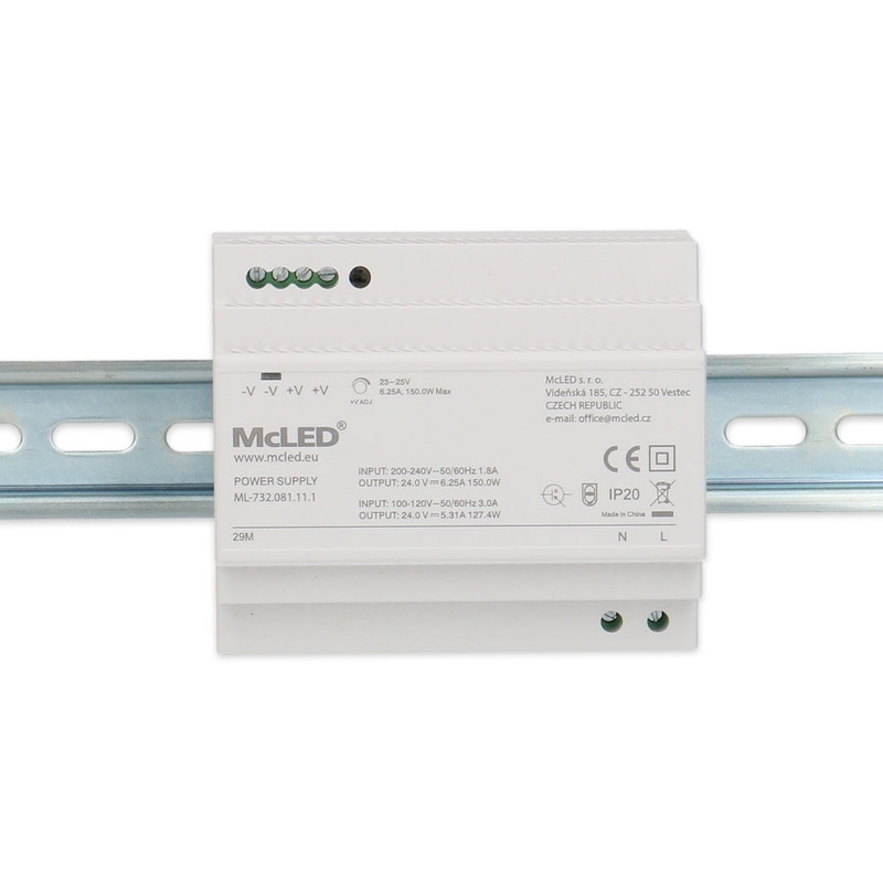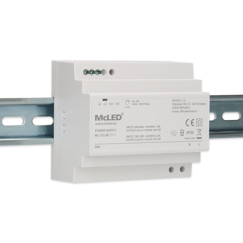 LED napájecí zdroj McLED® na DIN lištu s výkonem 150 W a výstupním napětím DC 24 V/6,25 A je ideální pro napájení LED pásků a dalších zařízení pracujících na stejnosměrné napětí. Je vybaven možností regulace výstupního napětí v rozsahu 23–25 V a má krytí IP20, což ho předurčuje pro použití v suchém prostředí. Montáž je jednoduchá díky kompatibilitě s DIN lištami DIN TS-35/7,5 a DIN TS-35/15. Pro zajištění spolehlivého provozu doporučujeme výkonovou rezervu minimálně 20 %.