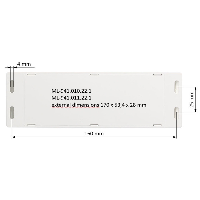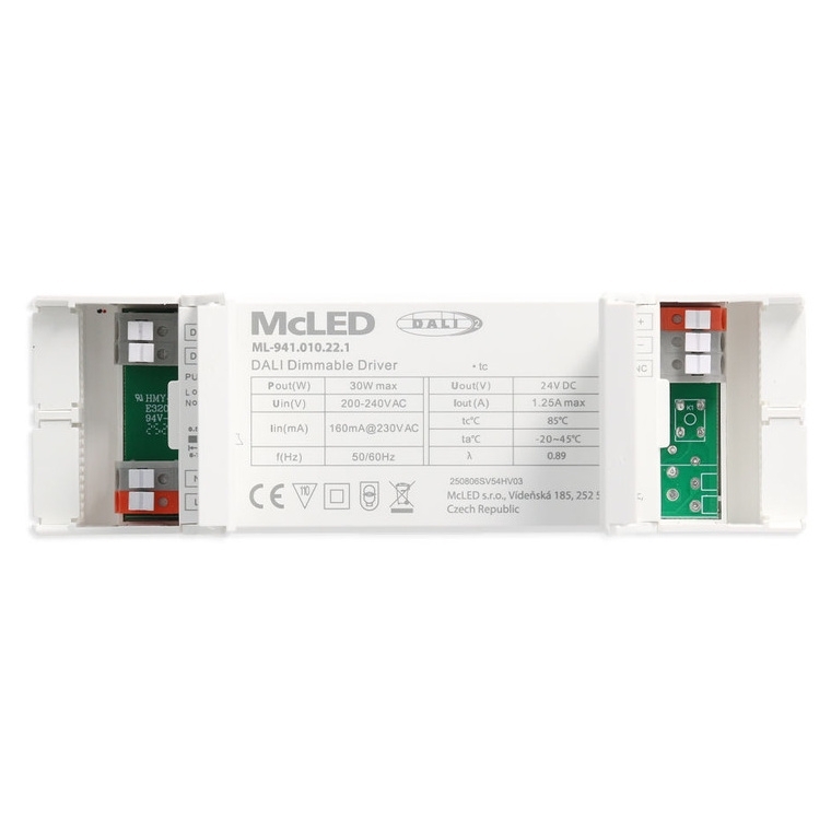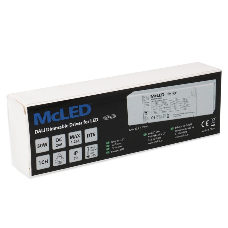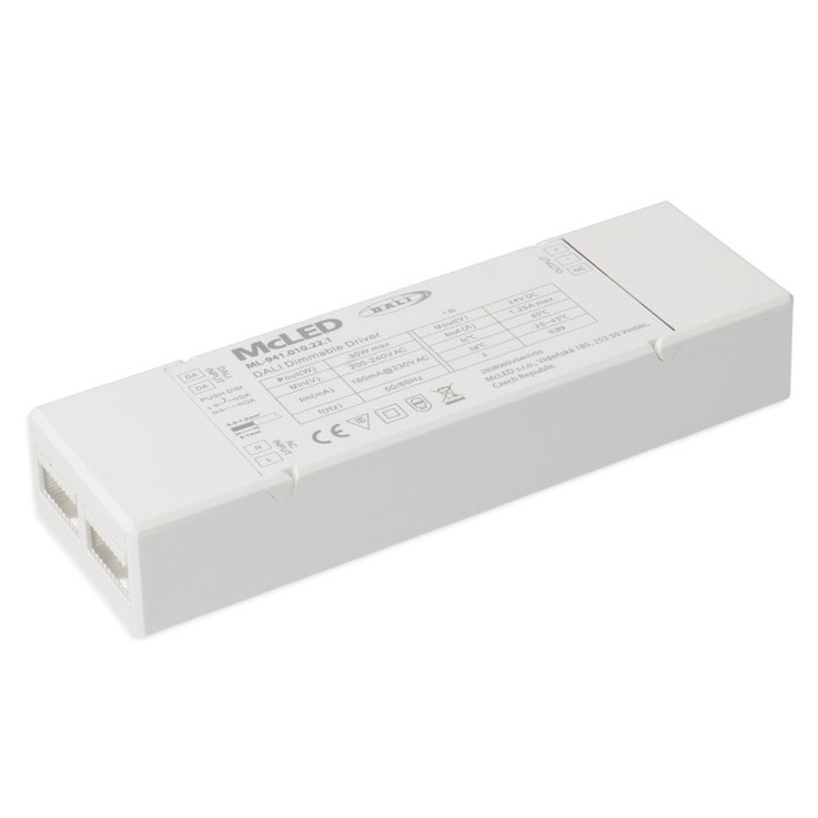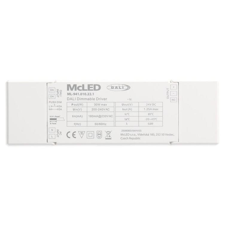 DALI stmívatelný zdroj McLED ML-941.010.22.1 je stmívatelný napěťový zdroj pro LED pásky. Výkon je 30 W, výstupní napětí DC 24 V a proud max. 1,25 A. Krytí je IP20, jeden výstupní kanál a vstupní napětí 200 - 240 V AC. Materiál krytu je plast, rozměry 170 x 53,4 x 28 mm, hmotnost 180 g a stmívání pomocí DALI nebo tlačítkem. Doba náběhu je cca 0,5 - 2 s. Certifikace: CE, SELV, F.
