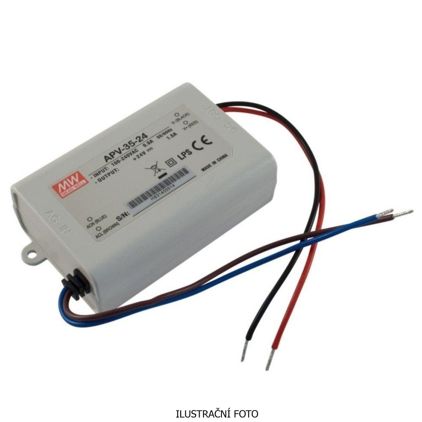 LED napájecí zdroj MEAN WELL APV-35-5 je určen pro aplikace s konstantním napětím (C.V.). Výstupní napětí činí 5 V DC, proudový rozsah 0-5,0 A a výkon 25 W. Zdroj je proveden v plastovém pouzdře a není vybaven funkcí stmívání. Rozměry zdroje jsou 84 x 57 x 29,5 mm.