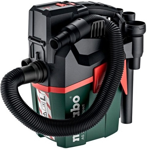 Aku vysavač AS 18 L PC vhodný na suché i mokré vysávání Akumulátorový vysavač METABO ideální pro menší čistící práce Funkce foukání k vyfukování, sušení a odvádění odpadního vzduchu Komerčně schválený akumulátorový vysavač, certifikovaný pro prach třídy L Ruční čištění filtru silným proudem vzduchu po stisknutí tlačítka (PressClean) Režim Eco pro delší dobu běhu na jedno nabití a režim boost pro maximální výkon Přihrádka na akumulátor chráněná před prachem a stříkající vodou s uzavíratelnou záklopkou Akumulátorový vysavač AS 18 L PC Compact (bez aku) ideální pro řemeslníky a na montáže Součástí dodávky 1x Roztahovací sací hadice (průměr 32 mm / 0,5-2,5 m), 1x připojovací nátrubek (vnitřní průměr 28 mm/vnější 35 mm), 3x sací trubky z plastu, 1x meziobjímka, 1x filtrační sáček z netkané textilie, 1x sací hubice (šířka 120 mm), 1x štěrbinová hubice, 1x nosný popruh