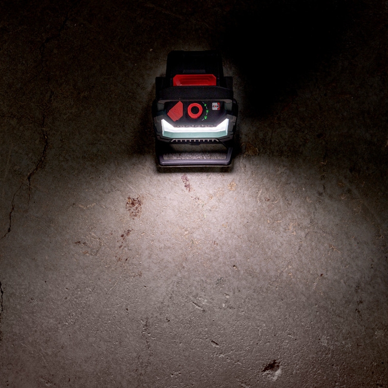 METABO BSA 18 LED 4000 je kompaktní akumulátorové stavební svítidlo se světelným tokem až 4000 lm pro velkoplošné a rovnoměrné osvětlení pracovní plochy a eliminaci stínů. Svítidlo má integrované magnety pro rychlou fixaci na kovové povrchy, rukojeť a lehkou kompaktní konstrukci pro snadné přenášení, a praktické možnosti zavěšení na podstavci i výřez v krytu. Hlavu lampy lze horizontálně otáčet o 270° a svítidlo nabízí plynulé stmívání; je zde také zobrazení zbývající doby běhu akumulátoru s blikajícím varováním před koncem. Je uzpůsobeno pro použití se stativem (závit 5/8"), chráněno proti prachu a stříkající vodě (IP54) a má USB přípojku pro nabíjení a provoz USB zařízení (max. nabíjecí proud 1 A); hmotnost je 1,9 kg bez akumulátoru (2,5 kg vč. akumulátoru).