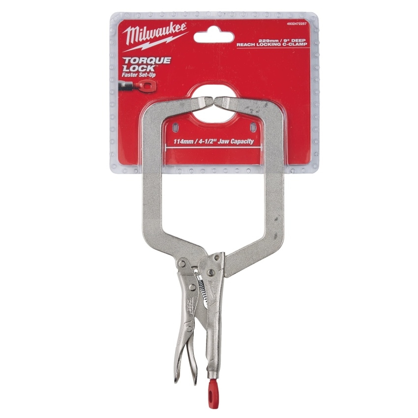 Upínací kleště MILWAUKEE TORQUE LOCK 9" typu C s hlubokým dosahem a pevnými čelistmi, s rychlým nastavením a pákovým uvolněním.