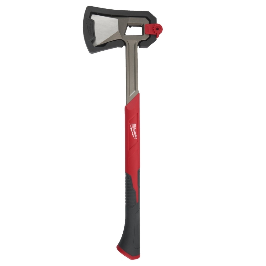 Štípací sekera MILWAUKEE 40 cm s kovanou ocelovou čepelí, vyztuženou rukojetí a pouzdrem pro bezpečné přenášení.