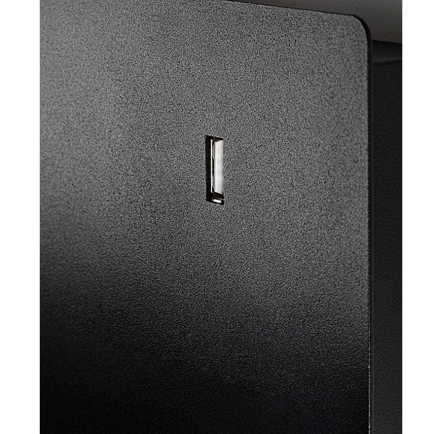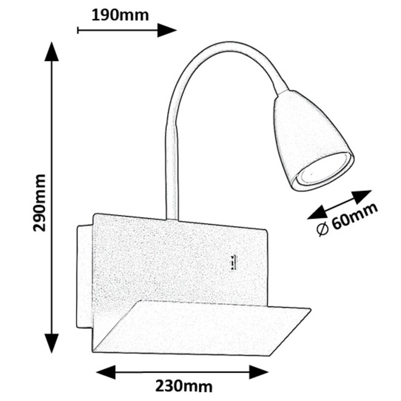 Tacito je moderní nástěnné svítidlo s elegantním černým kovovým tělem, které skvěle doplní interiér obývacího pokoje, ložnice nebo pracovny. Jeho válcová hlava s bílým plastovým stínítkem se směrem dolů rozšiřuje a díky ohebné čtecí stopce můžete světlo snadno nasměrovat podle potřeby. Praktickým doplňkem je integrovaný USB port, který umožňuje nabíjení mobilního telefonu přímo ze svítidla, a držák na telefon pro bezpečné odložení zařízení během nabíjení. Svítidlo je určeno pro jednu žárovku s paticí GU10 do 25 W, která není součástí balení. Díky rozměrům 290 × 230 mm a vzdálenosti od stěny 190 mm je vhodné pro umístění vedle postele či v relaxační zóně.