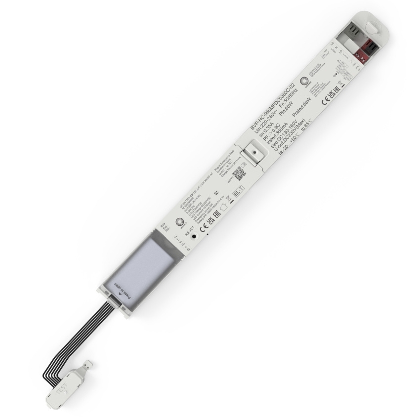 Nouzový modul LEDVANCE DP BATTEN CBO EL CG 200V 3H MT AT umožňuje snadno rozšířit standardní svítidla řady DP CBO (ON/OFF) o nouzovou funkci díky konceptu Plug & Upgrade. Integrovaná baterie LiFePO4 poskytuje autonomii > 3 h a údržbu zjednodušuje podpora manuálního (MT) i automatického (AT) testování, včetně rychlého přístupu přes integrovaný testovací spínač. Modul je vybaven bezšroubovou svorkou pro rychlé připojení, má kompaktní rozměry a odolné tělo z PC; je určen pro vnitřní použití (IP20) s provozem v rozsahu 0…+40 °C.
