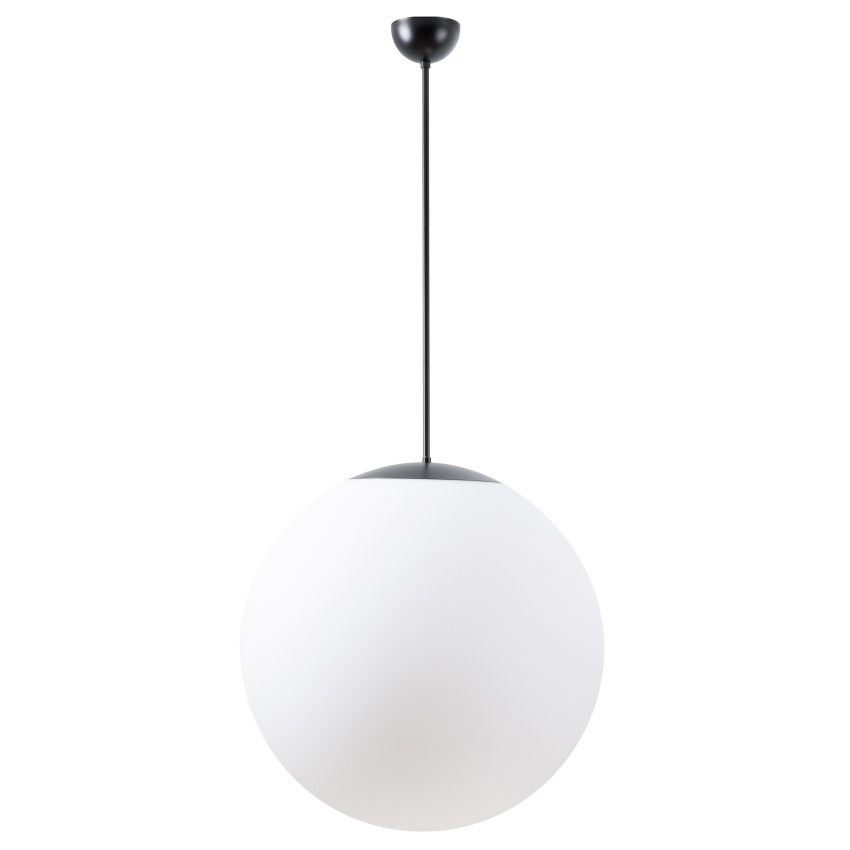 Černé závěsné žárovkové svítidlo ADRIA P4 v provedení ON/OFF s bílým stínidlem z třívrstvého skla TRIPLEX OPÁL a tyčovým závěsem o délce 60 cm.