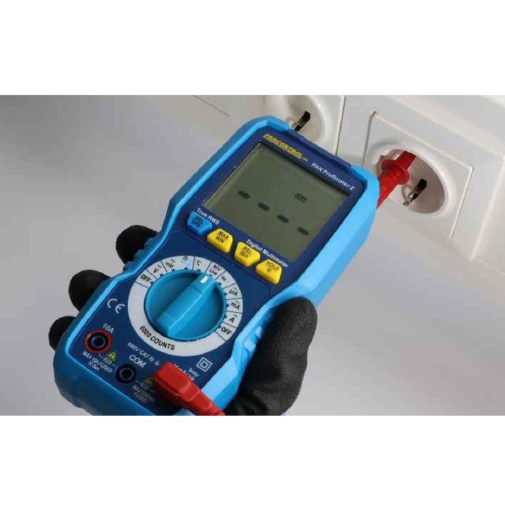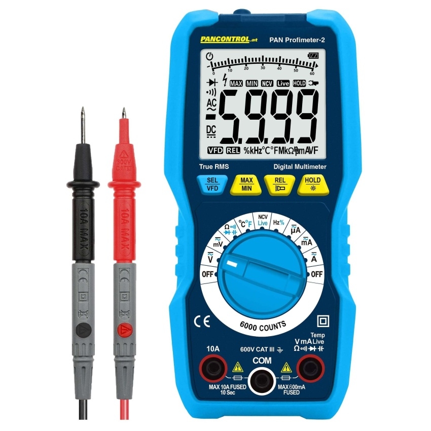 PAN Profimeter-2 je přesný profesionální digitální multimetr True RMS pro měření v elektrických instalacích až do CAT III 600 V, s podsvíceným displejem, bezkontaktním testerem napětí a bohatou sadou funkcí včetně teploty, frekvence a kapacity.