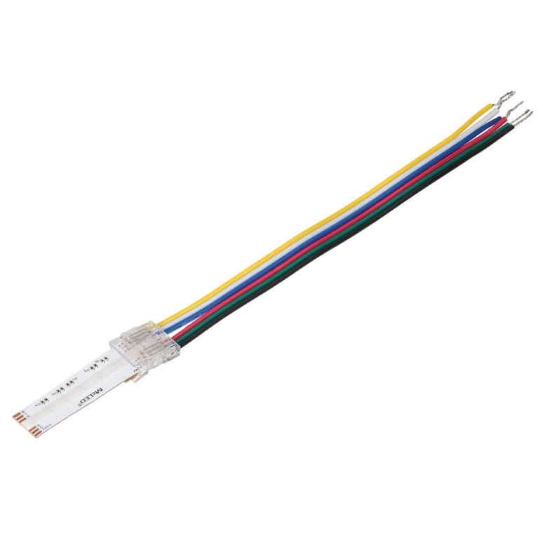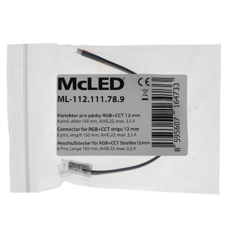 Připojovací konektor MCLED je určen pro RGB+CCT COB LED pásky o šířce 12 mm a je osazen šesti piny. Konektor je vybaven přívodním kabelem o délce přibližně 150 mm s vodiči o průřezu AWG22 (0,34–0,35 mm2). Provedení umožňuje připojení LED pásků k řízení bez nutnosti pájení a po nacvaknutí jej lze opakovaně použít. Tělo konektoru je vyrobeno z transparentního plastu a maximální proudové zatížení je 3,5 A.