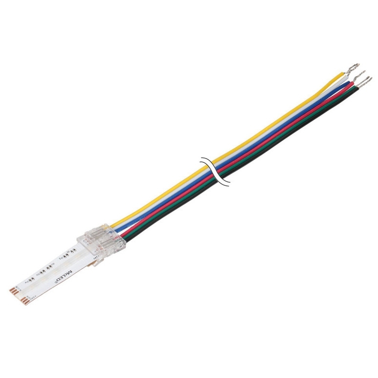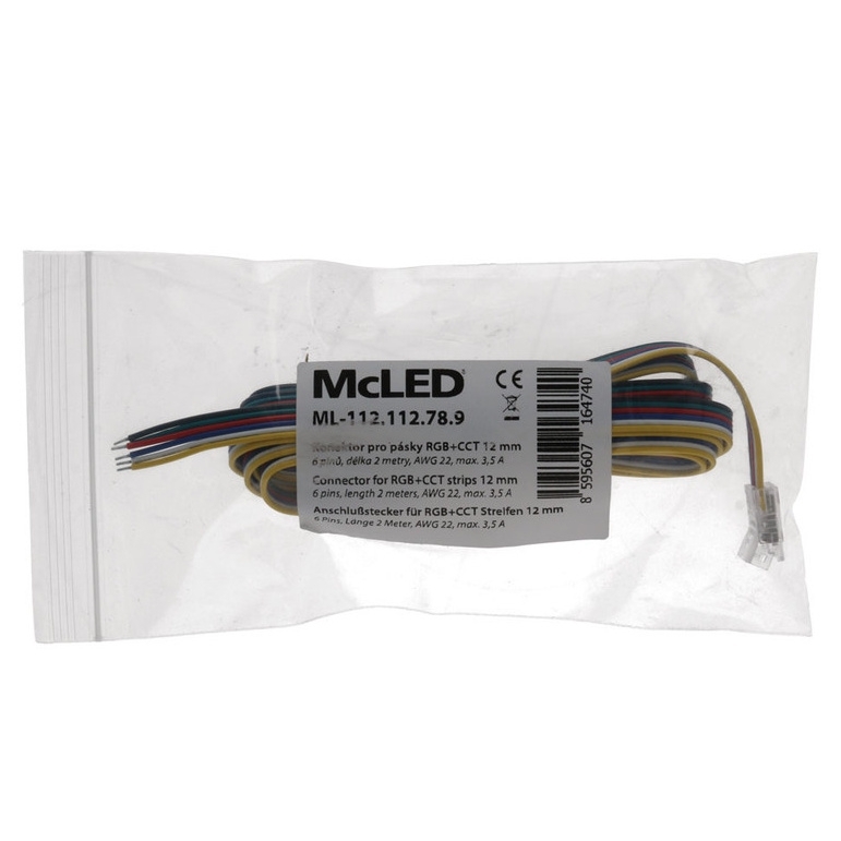 Připojovací konektor MCLED je určen pro RGB+CCT COB LED pásky o šířce 12 mm a je proveden se šesti piny. Konektor je osazen přívodním kabelem o délce přibližně 2000 mm s vodiči o průřezu AWG22 (0,34–0,35 mm2) v barevném značení žlutá, bílá, modrá, červená, zelená a černá. Transparentní plastové tělo konektoru umožňuje připojení LED pásků k řízení bez nutnosti pájení a po nacvaknutí jej lze opakovaně použít. Maximální proudové zatížení konektoru je 3,5 A.