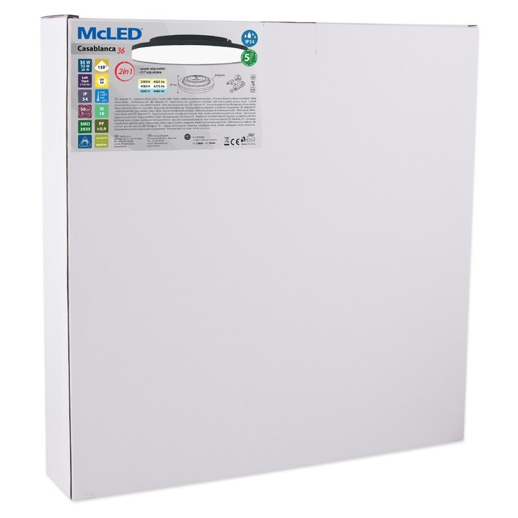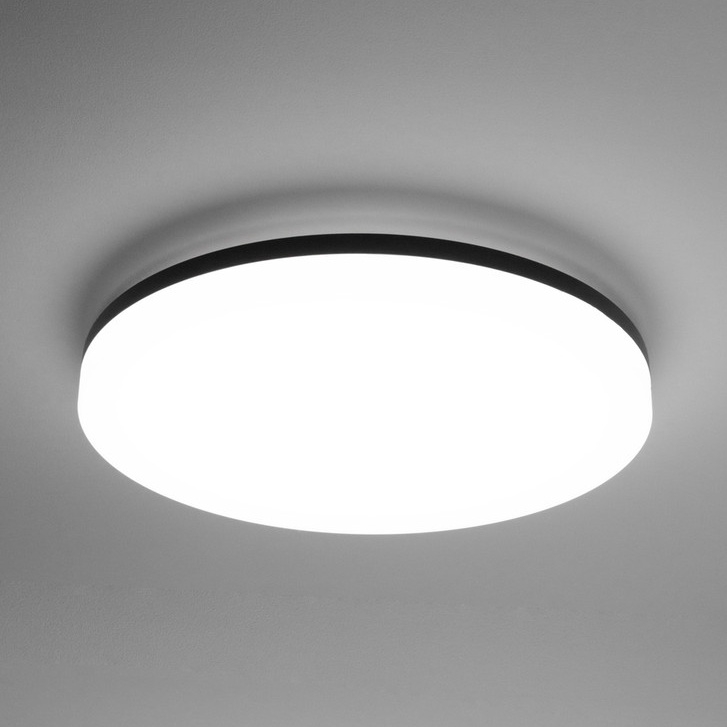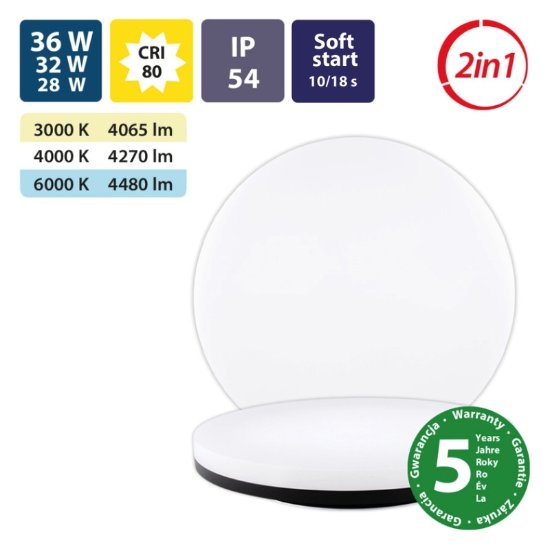 LED stropní svítidlo 36W černé, 230V, IP54, 3CCT - teplá, neutrální nebo studená bílá, max. světelný tok 4065lm/3000K, 4270lm/4000K, 4480lm/6000K, svíticí přímo/nepřímo (95/5%), vyzařovací úhel 150°, CRI 80, životnost 50.000h, rozměry o450x57mm, materiál plast, mléčný difuzor, nestmívatelné, PF>0,9, s přepínači výkonu 36/32/28W, teploty chromatičnosti 3000/4000/6000K a doby náběhu ≤1/10/18s, v rámci volitelného příslušenství lze dokoupit sadu pro zavěšení svítidla
