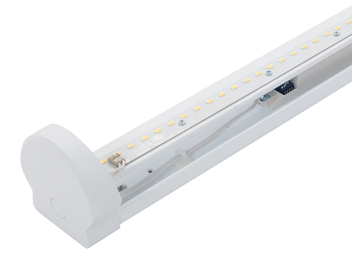 BELTR LED 2.5ft je plastové interiérové LED svítidlo určené pro montáž na strop nebo na stěnu. Funkce MultiLumen (ML) umožňuje jednoduché přepínání mezi až čtyřmi světelnými toky pomocí DIP přepínače na driveru, takže lze výkon osvětlení přizpůsobit aktuálním požadavkům. Toto provedení má světelný tok 8330 lm při příkonu 48,3 W (účinnost 140 lm/W), teplotu chromatičnosti 4000 K (spektrum 840) a index podání barev CRI 80–89. Svítidlo má krytí IP44, mechanickou pevnost IK08, toleranci chromatičnosti SDCM3 a životnost 50 000 hodin (L90/B10) a je určeno pro okolní teplotu -25 až 40 °C. Základna a reflektor jsou z ocelového plechu bílé barvy (RAL 9003) a difuzor je z translucentního polykarbonátu (PC), UV stabilního a nárazuvzdorného; kabelové vývodky jsou gumové. Svítidlo je vhodné pro kanceláře, chodby, interiéry škol, knihovny, posluchárny, sanitární prostory, nemocnice a odbavovací haly.