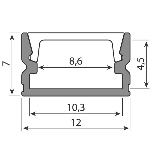 Přisazený hliníkový profil MCLED PM je určen pro instalaci LED pásků o maximální šířce 8 mm. Profil má rozměry průřezu přibližně 12 × 7 mm a je vyroben z hliníku s eloxovanou povrchovou úpravou v černé barvě. Součástí balení je mléčný (opalový) difuzor z PC materiálu, který je do profilu nacvakávací. Profil slouží k mechanickému krytí LED pásku a k jeho pasivnímu chlazení. Délka profilu je 1 metr.