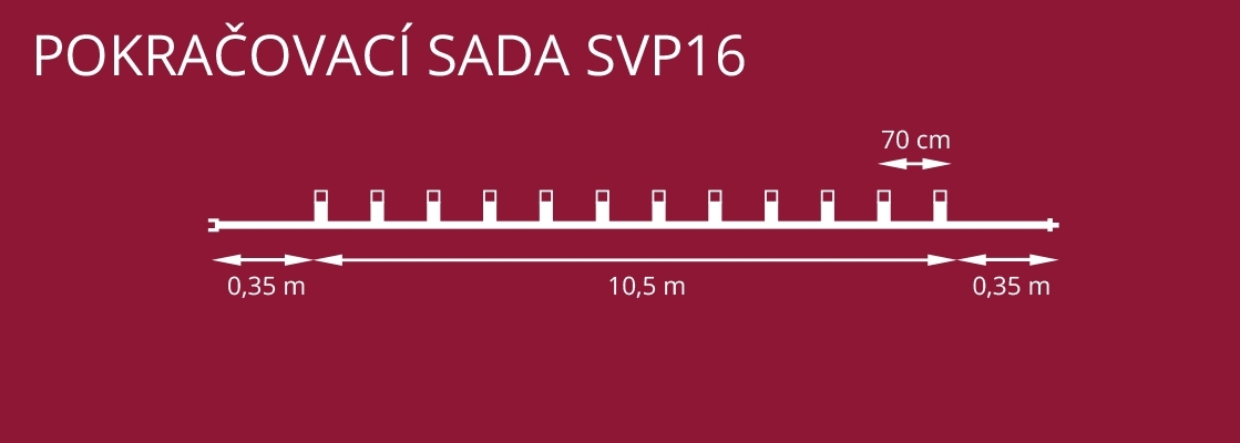 Prodlužovací souprava SVP-16 bez napájecího transformátoru. Je osazena LED Filamentovými světelnými zdroji zapojenými paralelně tj. jednotlivé světelné zdroje svítí nezávisle na sobě. Svíčková prodlužovací souprava je určena pouze k připojení k základní soupravě Sada START. Nemá vlastní zdroj napájení a má krátký přívod pouze 35 cm. K základní soupravě SVÍČKA "Sada START" je možné připojit MAXIMÁLNĚ 2 prodlužovací soupravy Svíčka SVP-16 . Maximální délka svítící části řetězu je potom 31,5 m.