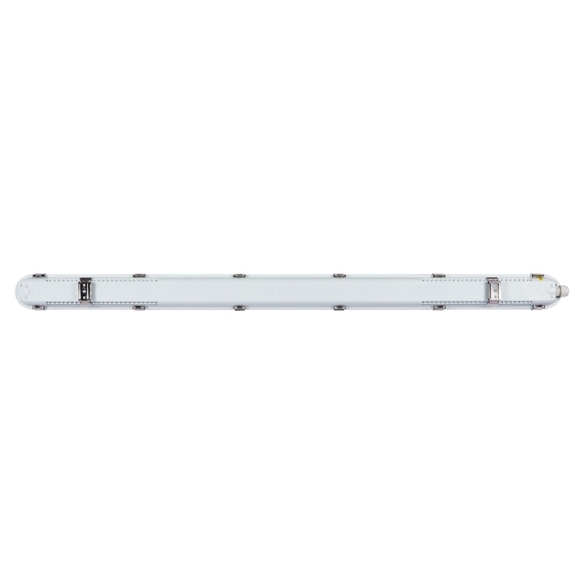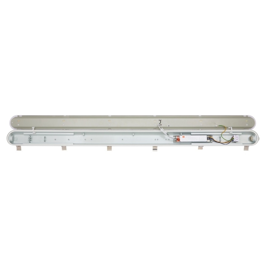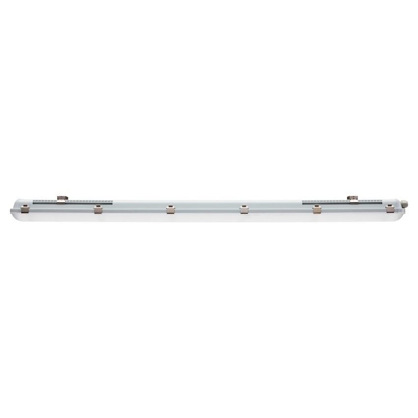 Start Eco Waterproof poskytuje vysoký výkon a odolnost pro použití například v parkovacích domech, skladech nebo dílnách. Jde o robustní voděodolné svítidlo s krytím IP65 a mechanickou odolností IK08 v délce 1200 mm se symetrickým širokým vyzařovacím úhlem. Světelný tok 2400 / 4800 lm se volí pomocí DIP přepínačů (odpovídající příkon 16 / 32 W) a integrovaným přepínačem lze zvolit teplotu chromatičnosti 3000 K / 4000 K / 6500 K; účinnost je 150 lm/W, CRI > 80 a SDCM < 5. Životnost je L70B50 59 000 h, elektrická ochrana Class I; instalaci usnadňují nerezové spony difuzoru a upevňovací držáky pro přisazenou montáž, tělo i difuzor jsou z polykarbonátu a v balení je závěsný hák, antivandal šrouby a doplňkové průchodky.