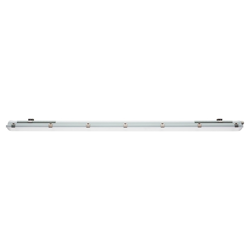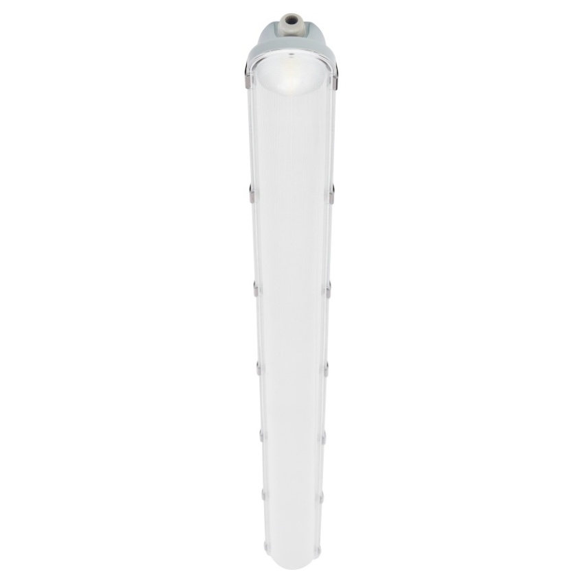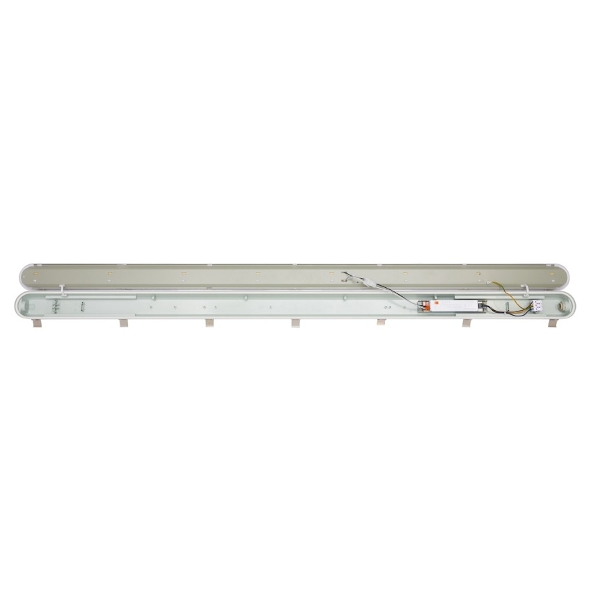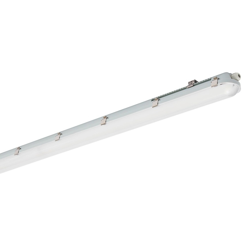 Start Eco Waterproof poskytuje vysoký výkon a odolnost pro použití například v parkovacích domech, skladech nebo dílnách. Jde o robustní voděodolné svítidlo s krytím IP65 a mechanickou odolností IK08 v délce 1500 mm se symetrickým širokým vyzařovacím úhlem. Světelný tok 3000 / 6000 lm se volí pomocí DIP přepínačů (odpovídající příkon 20 / 40 W) a integrovaným přepínačem lze zvolit teplotu chromatičnosti 3000 K / 4000 K / 6500 K; účinnost je 150 lm/W, CRI > 80 a SDCM < 5. Životnost je L70B50 56 000 h, elektrická ochrana Class I; instalaci usnadňují nerezové spony difuzoru a upevňovací držáky pro přisazenou montáž, tělo i difuzor jsou z polykarbonátu a v balení je závěsný hák, antivandal šrouby a doplňkové průchodky.
