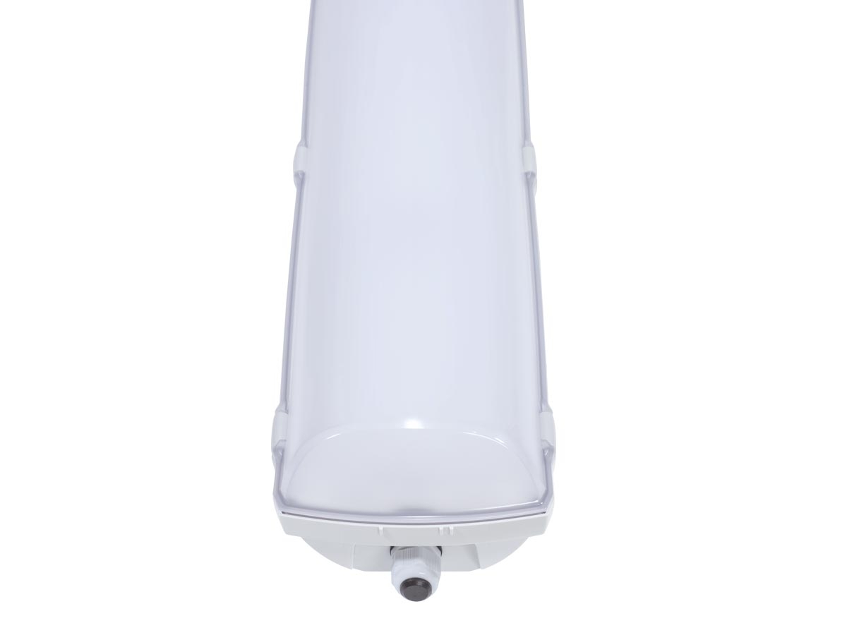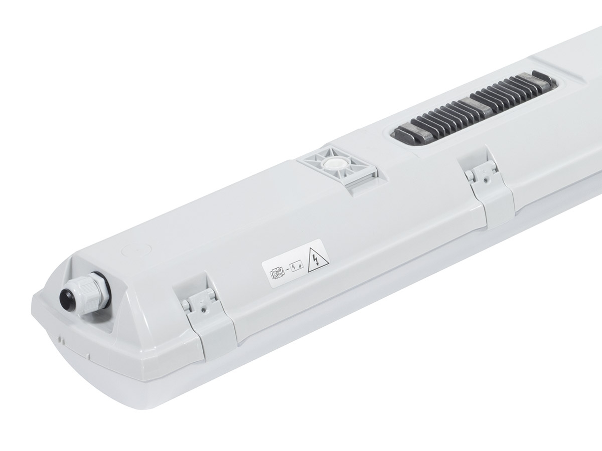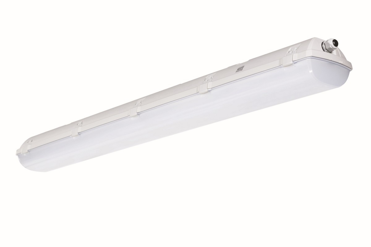 Průmyslové LED svítidlo TREVOS FUTURA 2.4ft ES PC Al 6400/840 3F M3hAt (kód 109128) s vysokou účinností 179 lm/W, krytím IP66 a nouzovým režimem s autotestem.