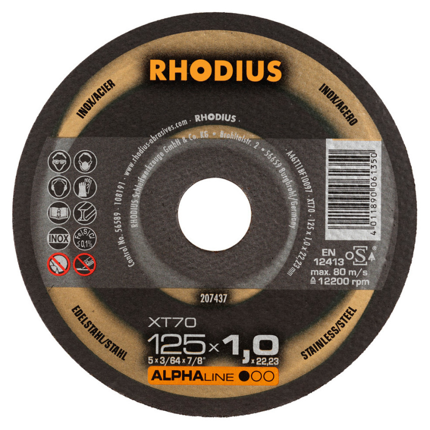 Kvalitní řezný kotouč RHODIUS XT70 s průměrem 125 mm a tloušťkou kotouče 1 mm pro řezání vysokopevnostní, vysokolegované i kalené oceli s malým úletem jisker a chladným řezem.