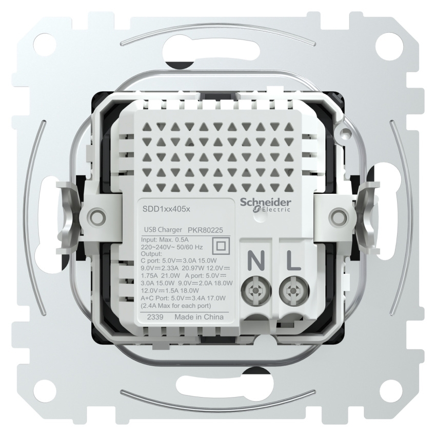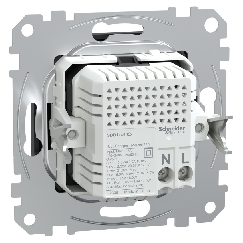 Rychlonabíječka Schneider Electric Sedna Design & Elements SDD111405 je určena pro zapuštěnou montáž a nabízí dvojité nabíjecí rozhraní USB-A a USB-C. Poskytuje celkový výkon až 21 W a podporuje moderní technologie rychlého nabíjení, včetně USB-C Power Delivery PPS. Nabíječka je vybavena ochranou proti přetížení, zkratu, přepětí i přehřátí a je vhodná pro nabíjení chytrých telefonů, sluchátek, tabletů a další elektroniky. Bílá lesklá povrchová úprava v odstínu RAL 9003 zajišťuje univerzální vzhled a snadné začlenění do interiéru. Mechanismus je osazen v montážním rámu a splňuje krytí IP20 a mechanickou odolnost IK02.