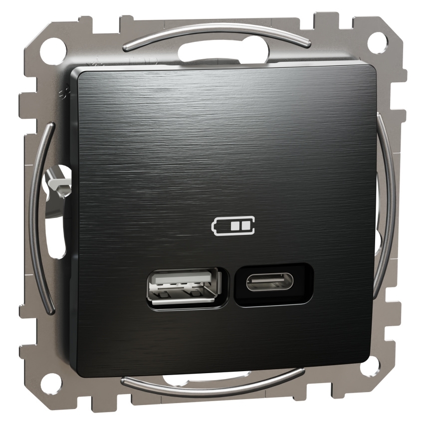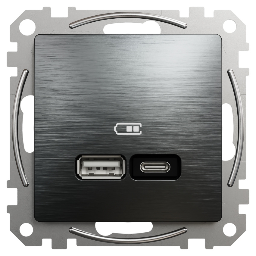 Dvojitá nabíječka USB A+C Schneider Electric Sedna Design Elements v provedení leštěný titan umožňuje rychlé a bezpečné nabíjení elektronických zařízení.