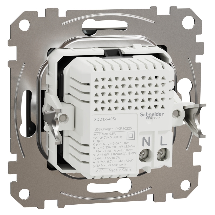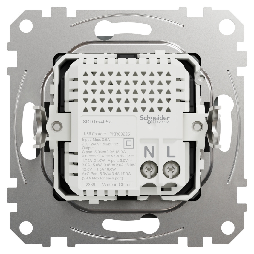 Nabíječka Schneider Electric Sedna Design Elements SDD172405U je vybavena dvěma USB výstupy – portem USB-A a portem USB-C – které podporují technologii Power Delivery pro efektivní a optimalizované nabíjení kompatibilních zařízení. Přístroj poskytuje maximální výstupní výkon 21 W a při současném použití obou portů nabízí společný výkon 17 W. Nabíječka pracuje s napájecím napětím 220–240 V AC při frekvenci 50/60 Hz a její pohotovostní spotřeba je nižší než 0,05 W. Konstrukce zahrnuje ochranu proti přehřátí, přepětí, zkratu a přetížení. Zapuštěná montáž a upevnění pomocí šroubů a rozpěrek zajišťují snadnou instalaci, zatímco povrchová úprava v dekoru kartáčovaného titanu dodává moderní vzhled. Rozměry přístroje jsou 73 × 73 × 44 mm a stupeň krytí IP20 je vhodný pro běžné interiérové použití.
