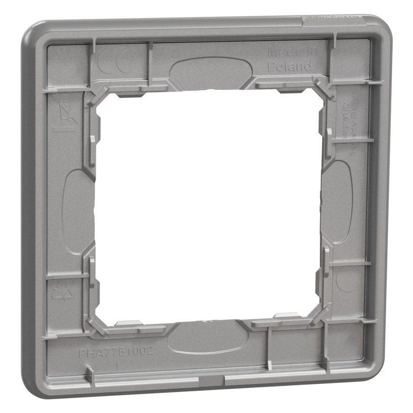 Jednonásobný krycí rámeček Schneider Electric Sedna Design Elements SDD393801 je univerzální rámeček určený pro instalaci 1 modulu v zapuštěné montáži. Lze jej použít i jako povrchově montované zařízení ve spojení s povrchovými instalačními krabicemi, přičemž upevnění je řešeno pomocí svorek. Rámeček je vyroben z termoplastu ABS stabilizovaného proti UV záření, v barevném odstínu Grey stone (šedý kámen, Pantone 4134C) s matnou povrchovou úpravou, a má rozměry 85 × 85 × 10 mm. Základní stupeň krytí je IP20, v kombinaci s kompatibilními vypínači a zásuvkami se stupněm krytí IP44 může sestava dosáhnout vyšší ochrany a zároveň nabízí moderní vzhled odpovídající řadě Sedna Design & Elements.:contentReference[oaicite:0]{index=0}