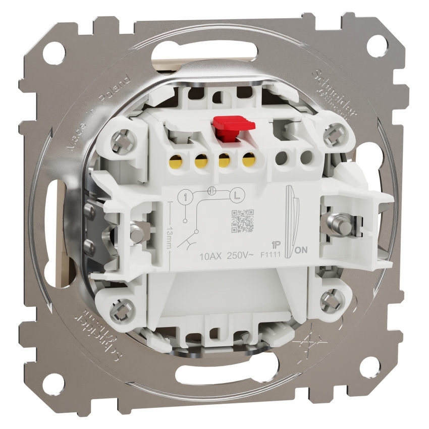 Spínač Schneider Electric Sedna Design Elements SDD180111U v provedení bříza (Pantone 4685C) je 1pólový 1cestný přístroj určený pro zapuštěnou montáž. Je vybaven bezšroubovými svorkami, které umožňují připojení vodičů o průřezu 1,5–2,5 mm2. Přístroj využívá upevnění pomocí šroubů nebo montážních drápků. Jmenovitý proud činí 10 A a provozní napětí je 250 V AC při frekvenci 50 Hz. Tělo je vyrobeno z polykarbonátu s matnou povrchovou úpravou a UV potiskem. Rozměry přístroje jsou 73 × 73 × 37 mm. Stupeň krytí je IP20 a mechanická odolnost IK02. Produkt splňuje normu IEC 60669-1.