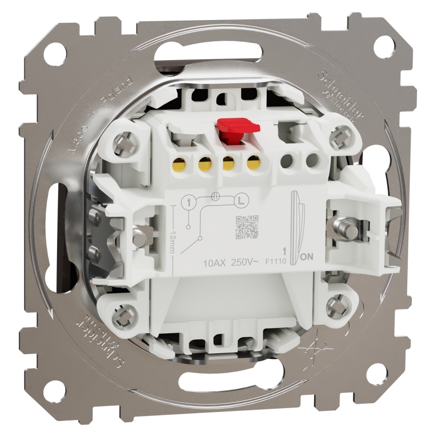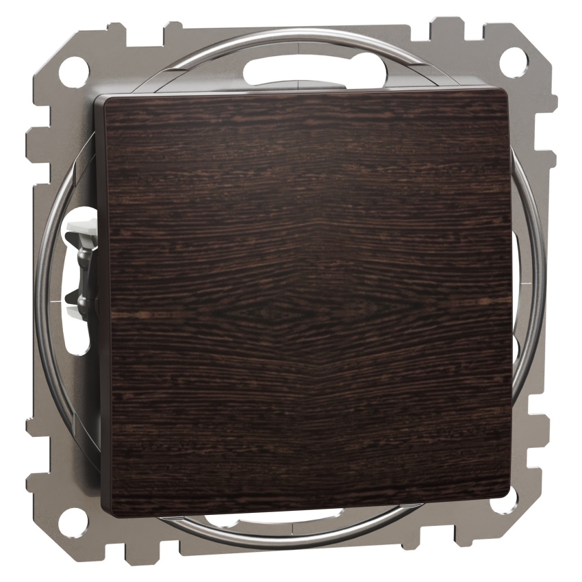 Spínač Schneider Electric Sedna Design Elements SDD181101U je jednopólové 1cestné provedení určené pro zapuštěnou montáž. Přístroj je vybaven bezšroubovými svorkami pro vodiče o průřezu 1,5–2,5 mm2 a umožňuje upevnění pomocí šroubů nebo montážních strmenů v rozsahu 52–67 mm. Jmenovitý proud činí 10AX a pracovní napětí je 250 V AC při frekvenci 50 Hz. Kryt i mechanismus jsou vyrobeny z polykarbonátu s povrchovým provedením wood wenge (Pantone 439C), v semi-matné úpravě a s UV potiskem. Rozměry přístroje jsou 73 × 73 × 37 mm. Stupeň krytí je IP20 a mechanická odolnost odpovídá IK02. Produkt splňuje normu IEC 60669-1.