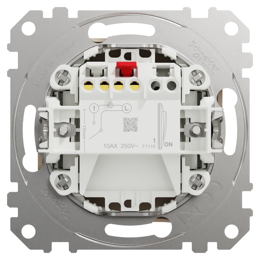Jednopólový spínač Schneider Electric Sedna Design/Elements SDD180101U je přístroj ř.1 s jmenovitým proudem 10 AX při provozním napětí 250 V AC a frekvenci 50 Hz. Je určen k zapuštěné montáži a má šroubové upevnění. Spínač je vybaven bezšroubovými svorkami, které usnadňují instalaci a údržbu. Rozměry přístroje jsou 73 mm (šířka) × 73 mm (výška) × 37 mm (hloubka). Je vyroben z polykarbonátu a má povrch v dekoru dřevěná bříza s matnou úpravou. Stupeň krytí je IP20 a výrobek splňuje normu IEC 60669-1.