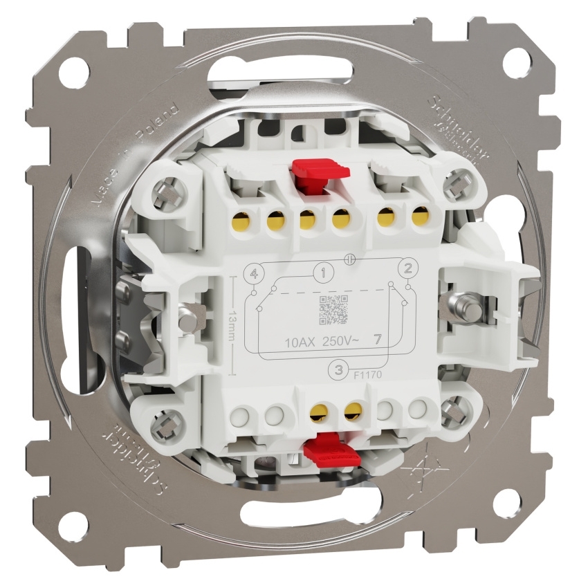 Křížový spínač Schneider Electric Sedna Design Elements SDD170107U je určen pro zapuštěnou montáž a poskytuje spolehlivé ovládání díky elektromechanickému provedení. Je vybaven bezšroubovými svorkami, které umožňují snadné připojení vodičů a přispívají k rychlé instalaci. Spínač má povrchovou úpravu v dekoru leštěného hliníku a je vyroben z odolného polykarbonátu. Pracuje při jmenovitém proudu 10 AX a napětí 250 V AC s frekvencí 50 Hz. Rozměry 73 × 73 × 37 mm zajišťují kompatibilitu se standardními instalačními krabicemi, stupeň krytí IP20 odpovídá použití v běžném interiéru.