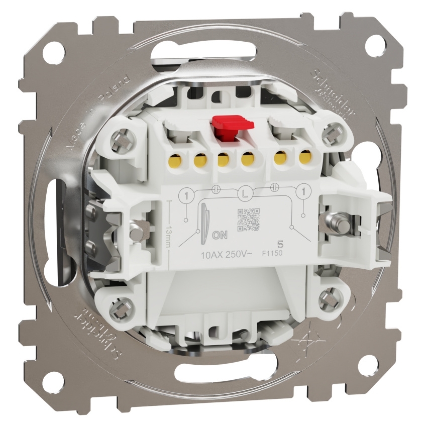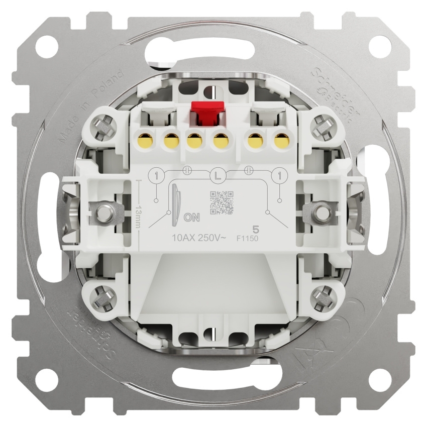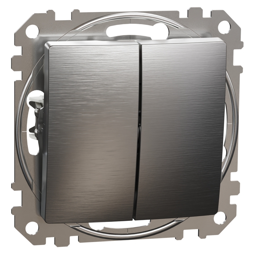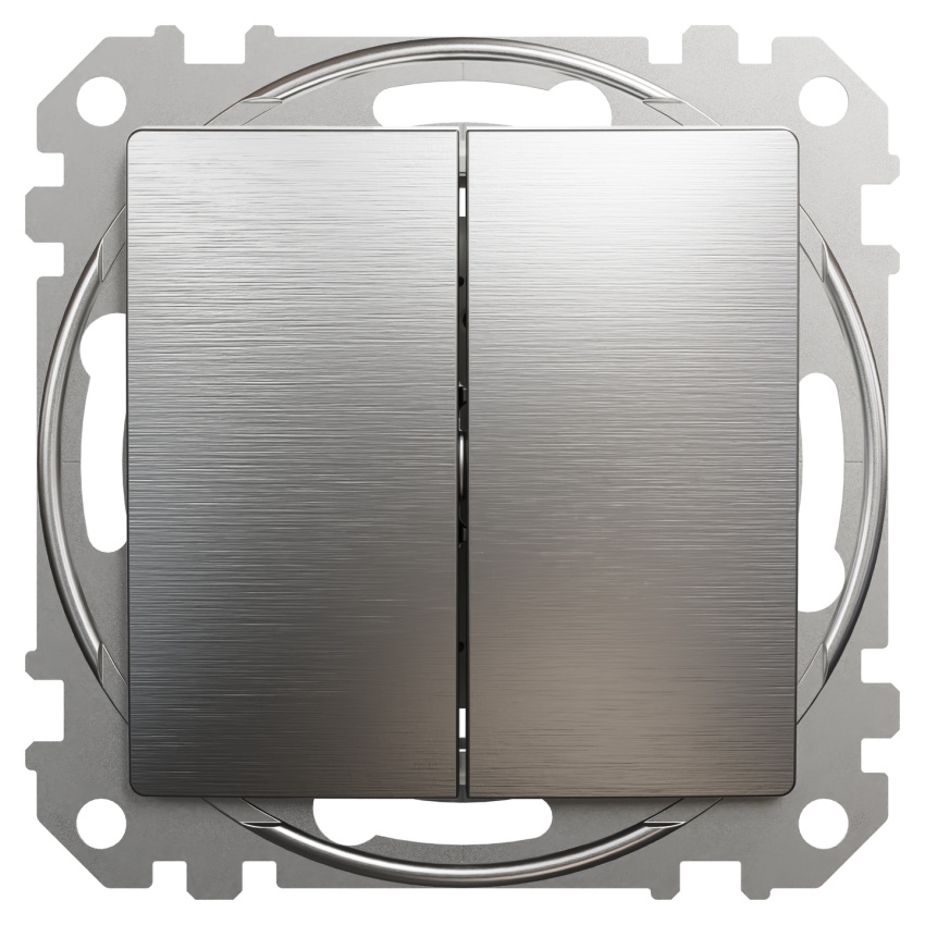 Sériový spínač Schneider Electric Sedna Design Elements SDD170105U umožňuje ovládání dvou světelných okruhů díky funkci spínače se dvěma obvody. Přístroj je určen pro zapuštěnou montáž a lze jej upevnit rozpěrkami v rozsahu 52–67 mm nebo pomocí šroubů. Jmenovitý proud spínače je 10AX a jmenovité pracovní napětí 250 V AC při frekvenci 50 Hz. Mechanismus je elektromechanický s ovládací kolébkou. Svorky jsou bezšroubové a vhodné pro vodiče 1,5–2,5 mm2, včetně pevných, lankových i ohebných vodičů. Kryt je z polykarbonátu s povrchem brushed aluminium (Pantone 8400C), lesklou úpravou a UV tiskem. Rozměry produktu jsou 73 × 73 × 37 mm. Stupeň krytí odpovídá IP20 a mechanická odolnost IK02. Produkt splňuje normu IEC 60669-1.
