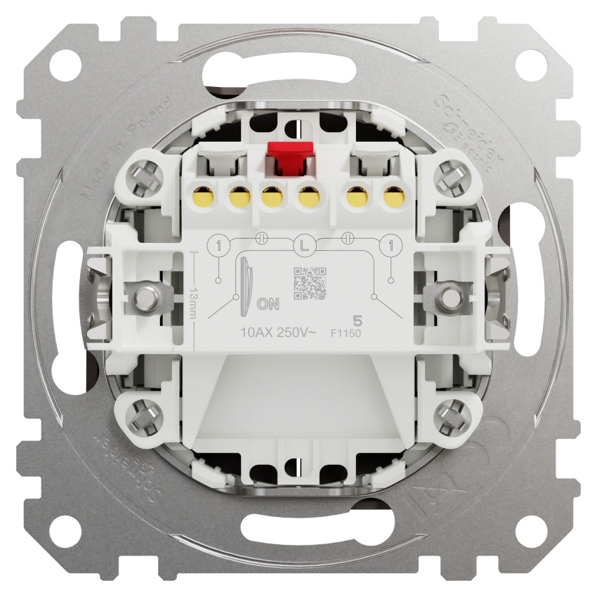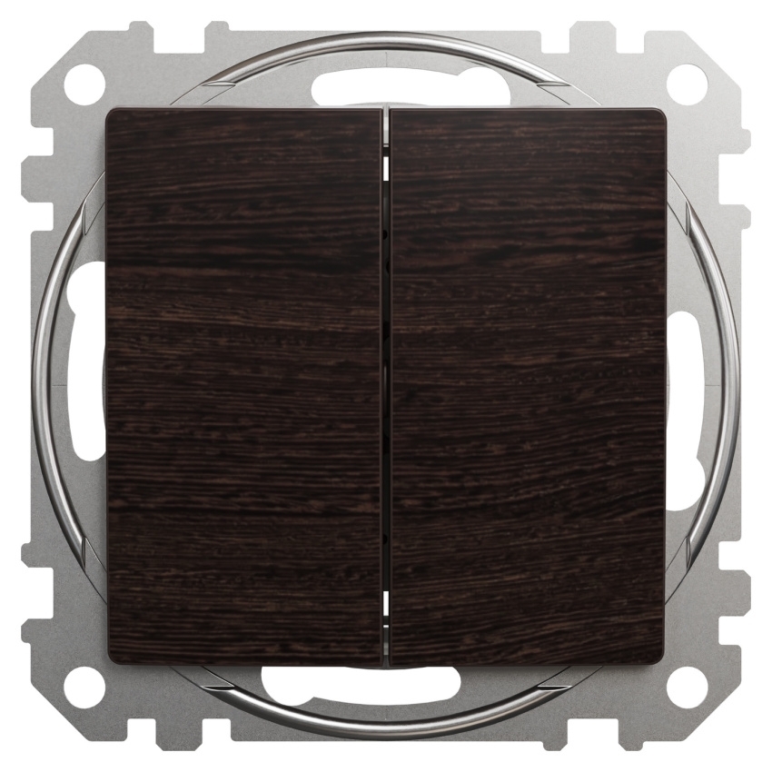 Sériový spínač Schneider Electric Sedna Design Elements ř. 5 v dekoru wenge umožňuje ovládání dvou samostatných světelných okruhů. Spínač je vybaven bezšroubovými svorkami vhodnými pro pevné, lankové i ohebné vodiče. Zařízení je určeno pro zapuštěnou montáž a jeho upevnění lze provést pomocí rozpěrek nebo šroubů. Mechanismus je elektromechanický, s kolébkovým ovládáním a jmenovitým proudem 10AX při napětí 250 V AC a frekvenci 50 Hz. Rozměry přístroje jsou 73 × 73 × 37 mm. Spínač je vyroben z polykarbonátu a má semi-matný povrch v odstínu wenge.