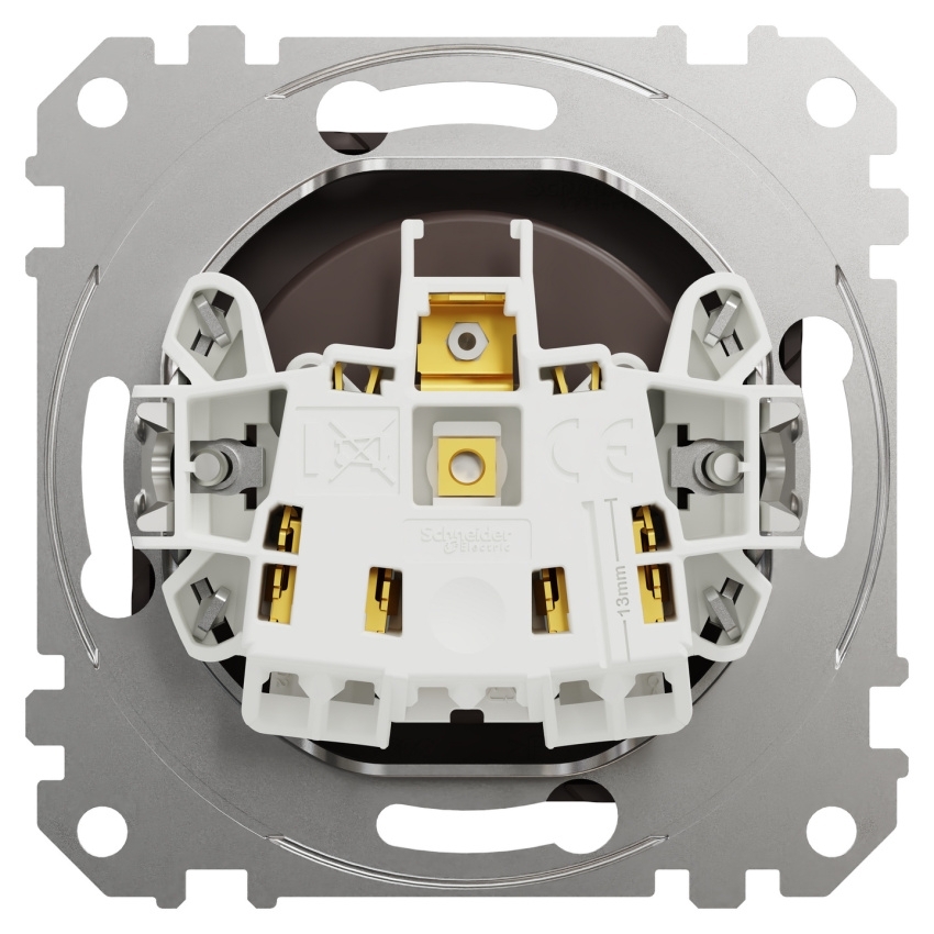 Zásuvka Schneider Electric Sedna Design Elements SDD181012U je zemnící zásuvka 2P+E s bezšroubovými svorkami určená pro zapuštěnou montáž. Splňuje standard CEE 7/5 se zemnícím kolíkem a normu IEC 60884-1, jmenovitý proud je 16 A a jmenovité pracovní napětí 250 V AC při frekvenci 50 Hz. Tělo přístroje je vyrobeno z polykarbonátu (PC), kryt je v dekoru dřevo wenge s polomatnou povrchovou úpravou a zásuvka je vybavena clonkami. Upevnění je řešeno šrouby nebo rozpěrkami v rozsahu 52–69 mm, stupeň krytí je IP20 a mechanická odolnost IK02, rozměry viditelné části jsou 73 × 73 mm a hloubka přístroje 38 mm.